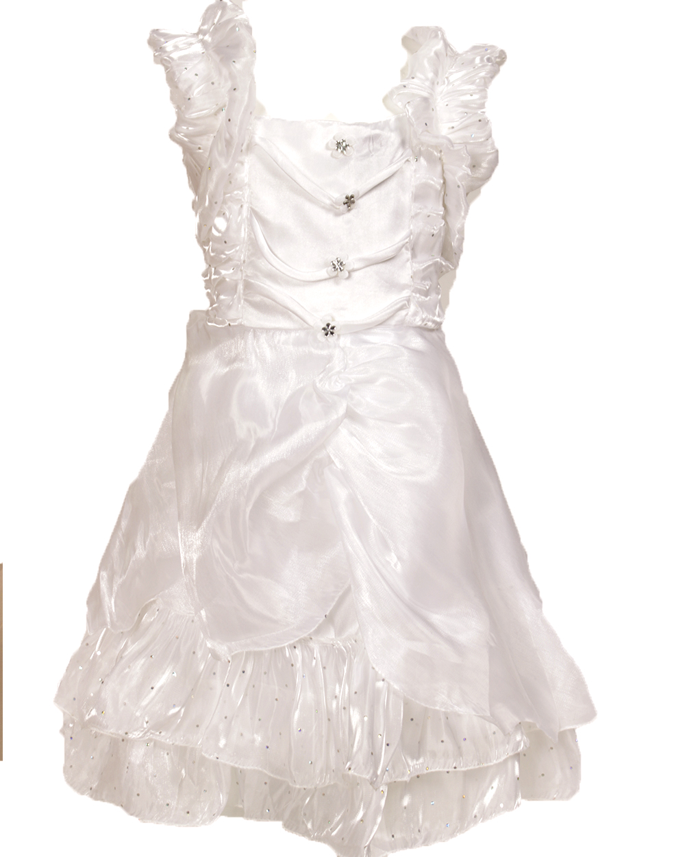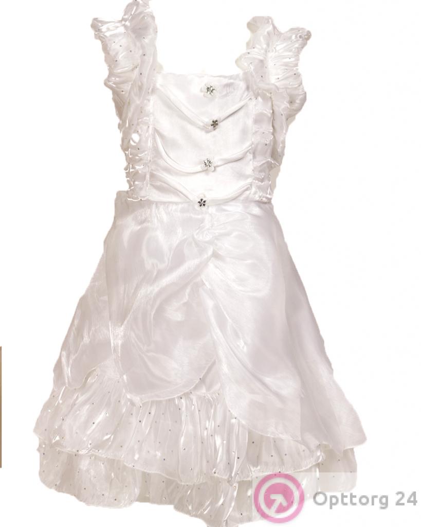 Милое платье для девочек белого цвета. Модель украшена лентами с выложеными на ней стразами в виде цветочков.