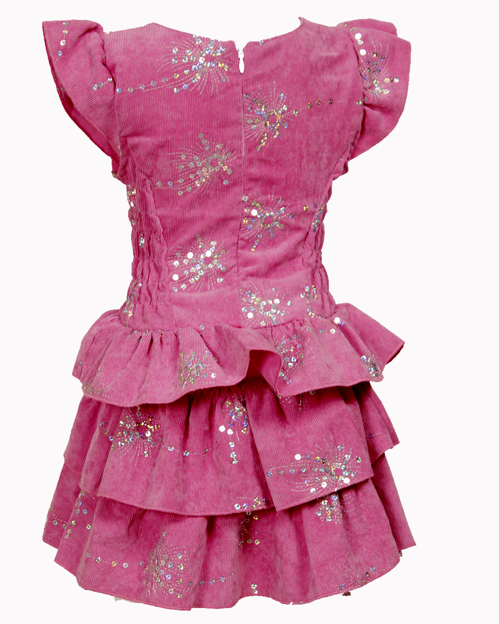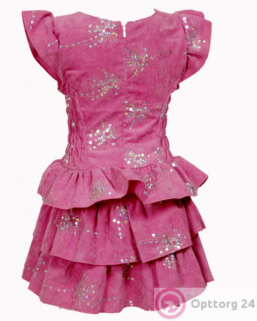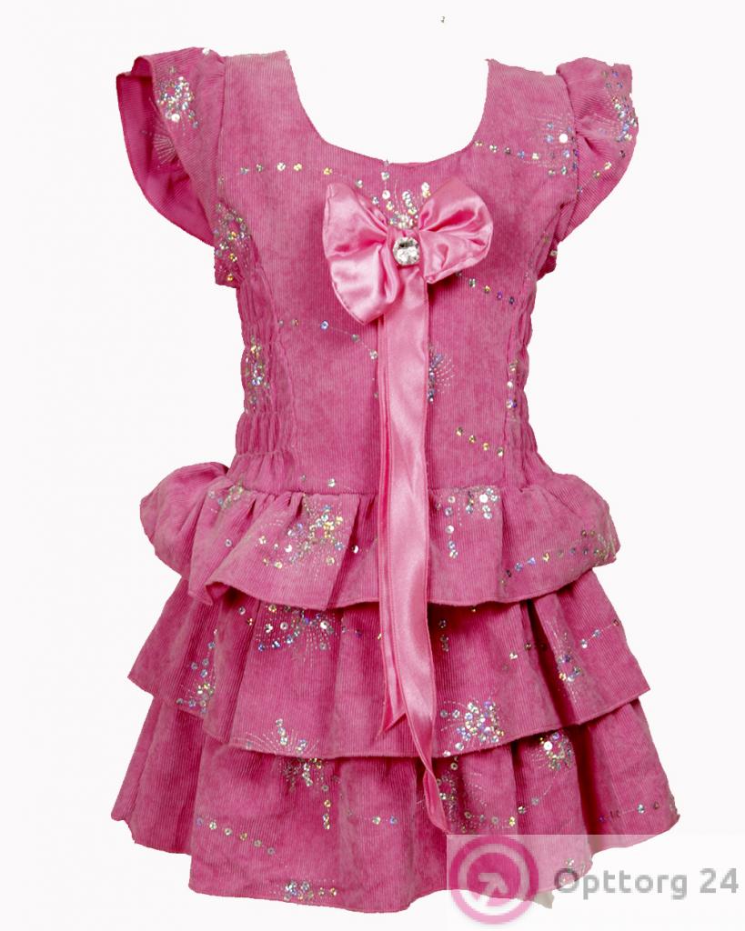 Стильное платье для девочки нежно розового цвета. Модель украшена бантом в области груди и мелкими блёстками по всей поверхности.