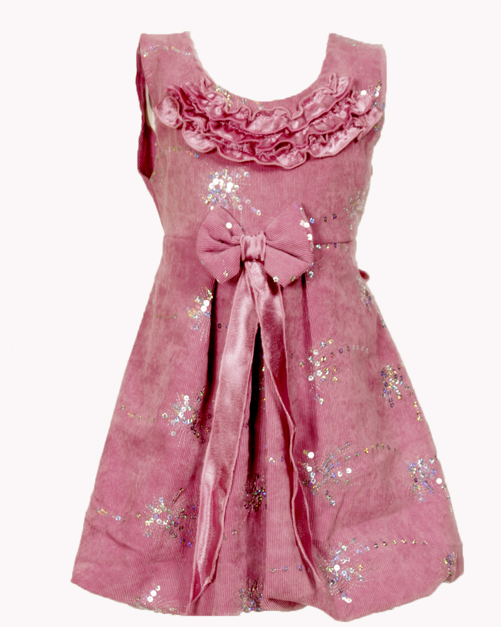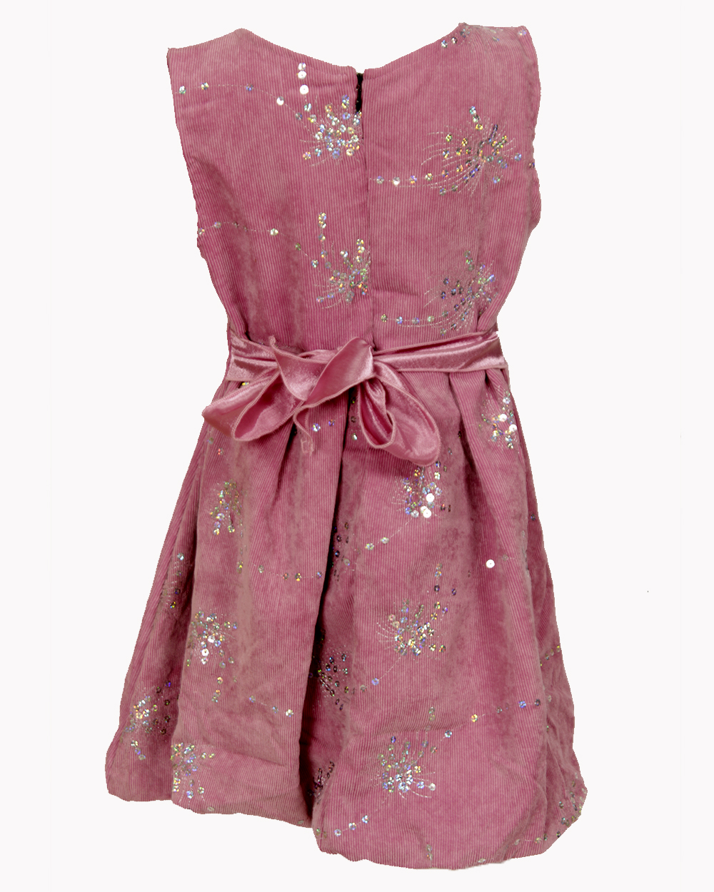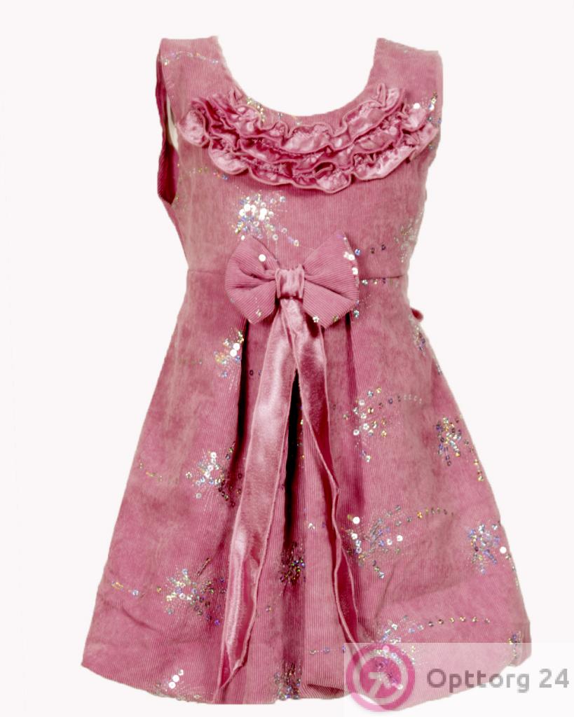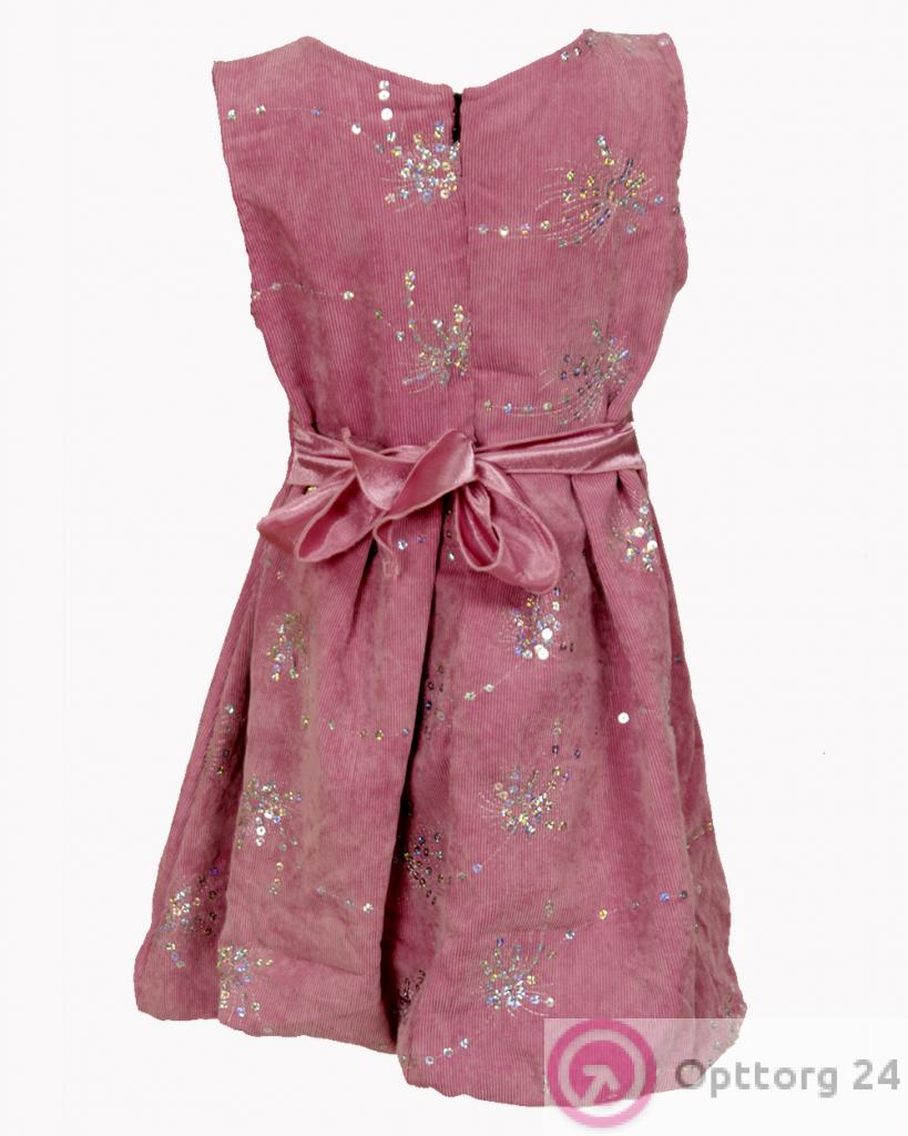 Детское платье нежно-розового цвета с блёстками и большим бантом в области талии.