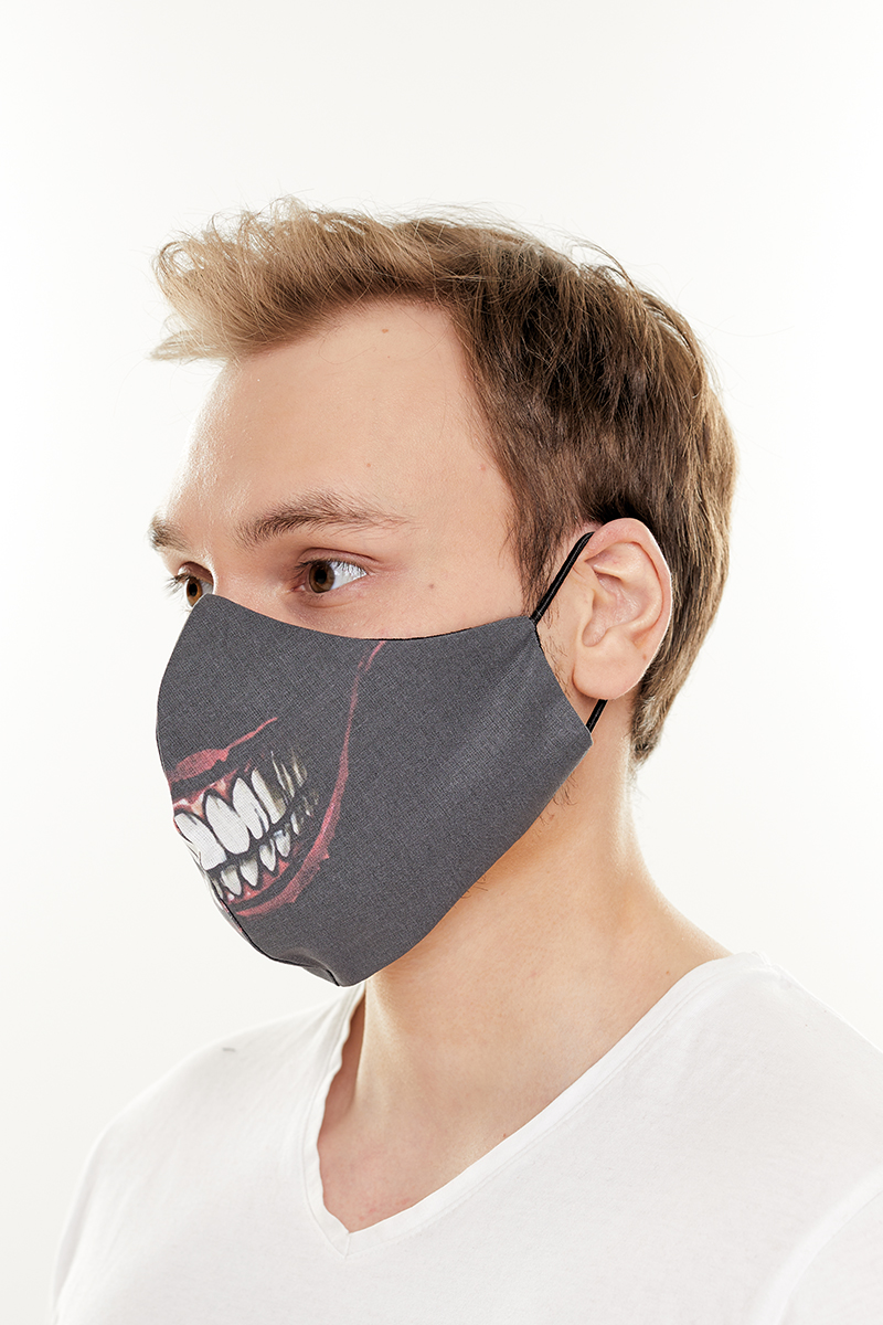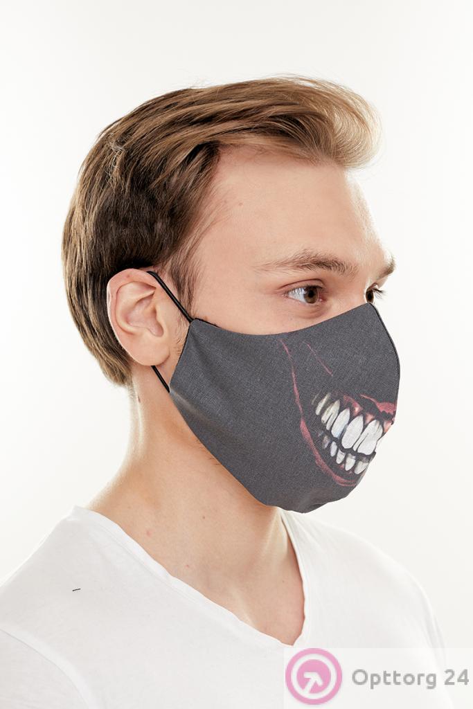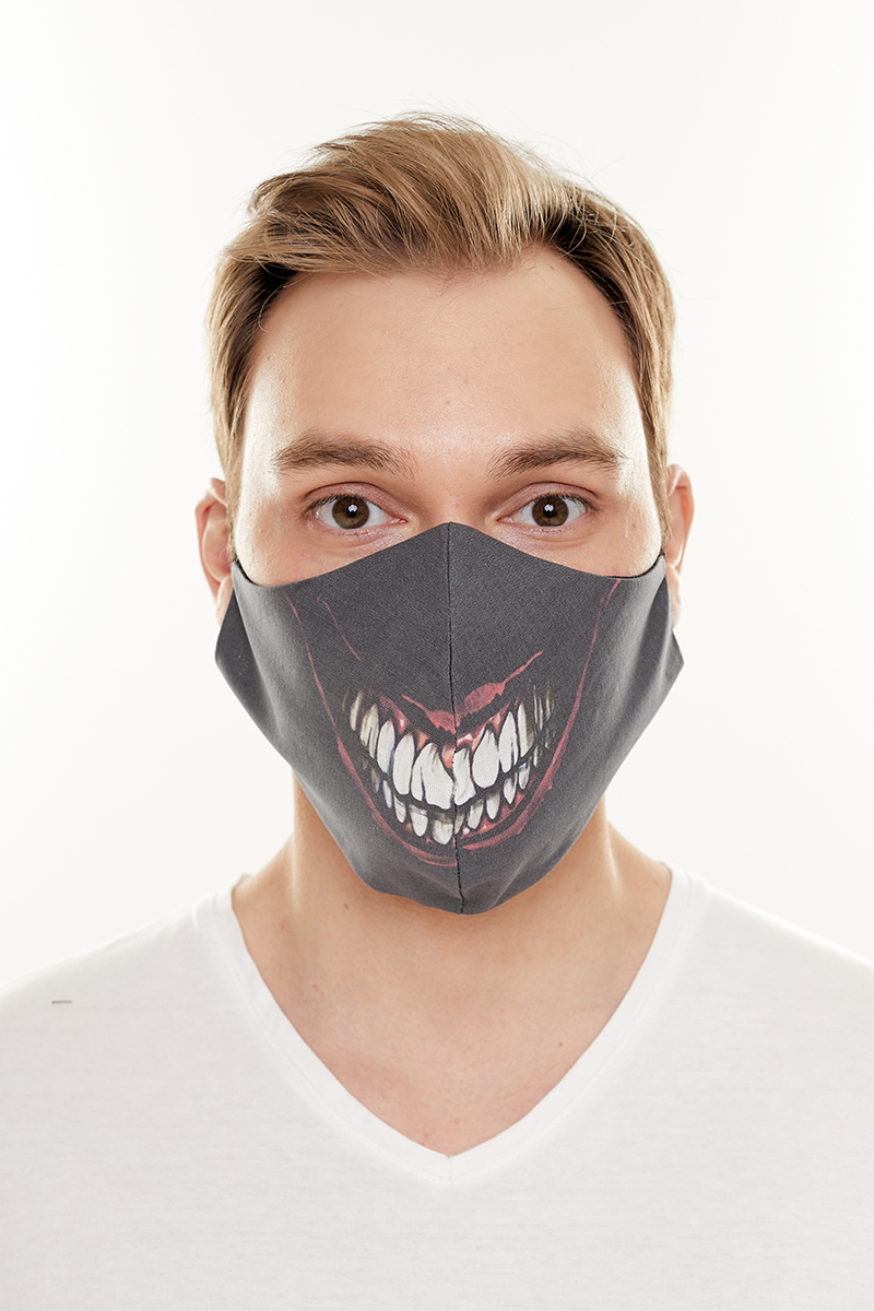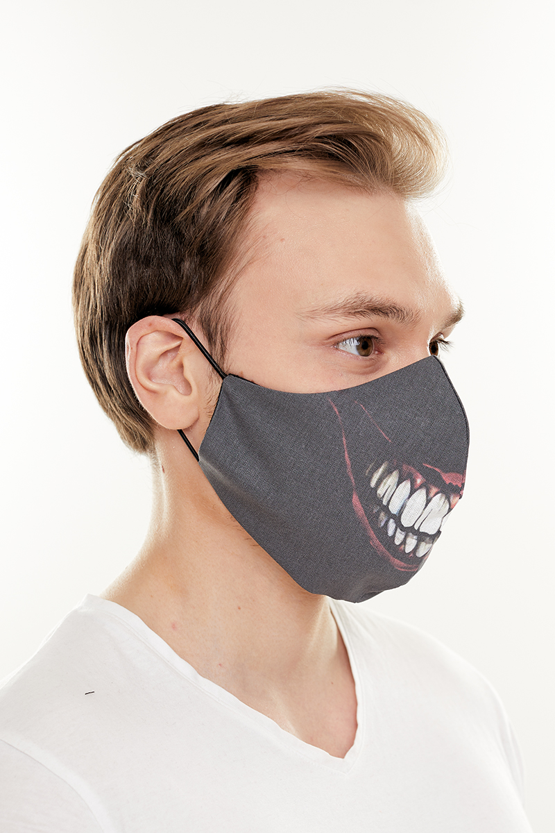 Описание: Маска тканевая двухслойная многоразового использования черного цвета с принтом зубов. После использования для защиты нуждается в стирке.