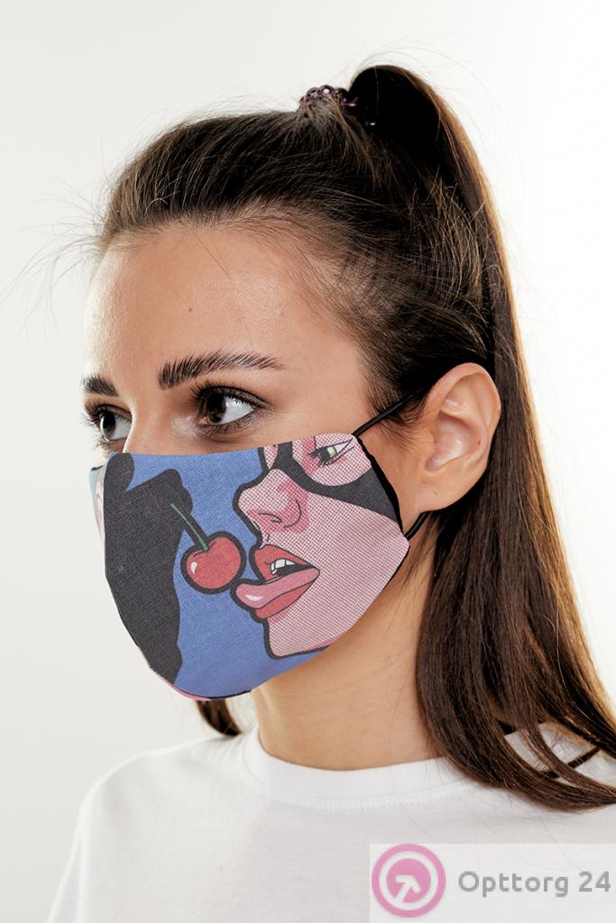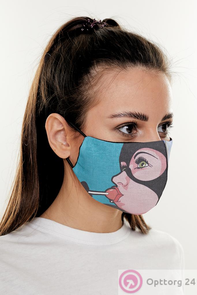 Описание: Маска тканевая двухслойная многоразового использования с принтом изображения девушки. После использования для защиты нуждается в стирке.