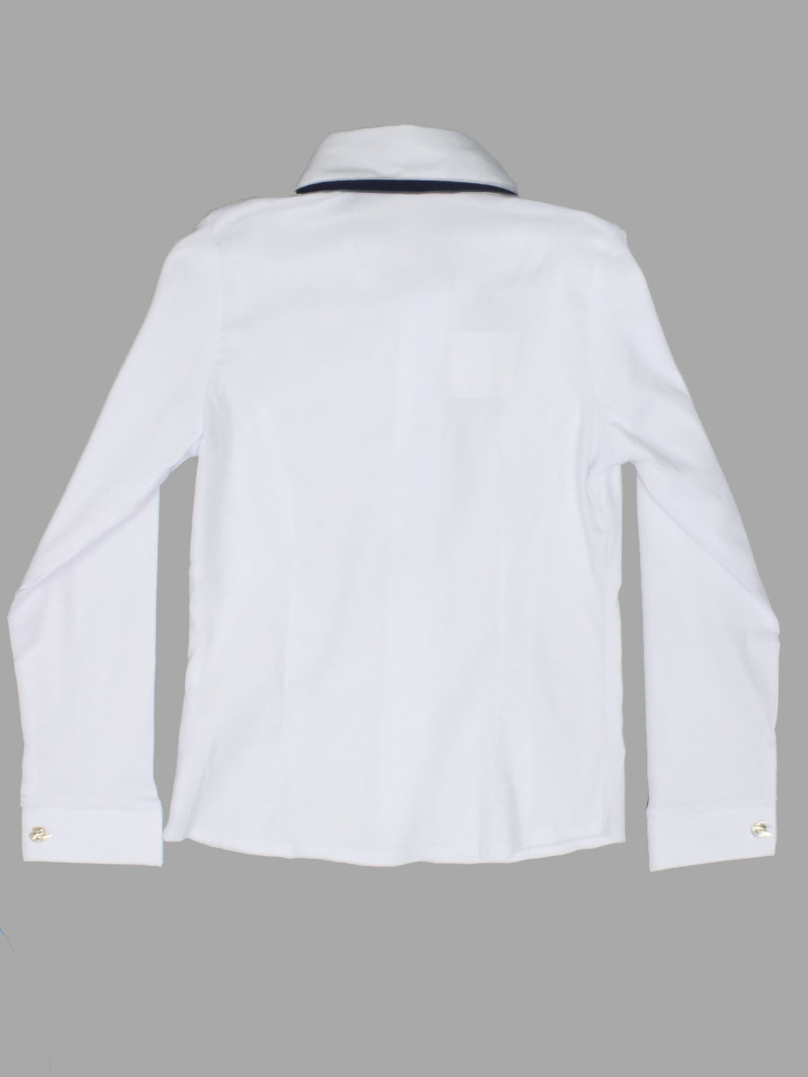 Детская блузка белого цвета с темно-синим галстуком на пуговицах.