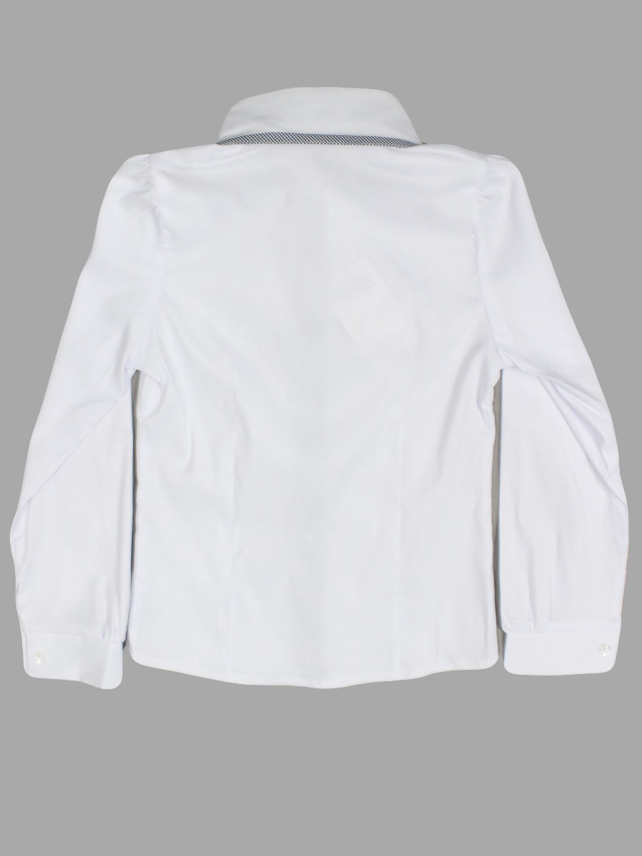 Блузка детская белого цвета с рябой окантовкой и завязкой на вороте.