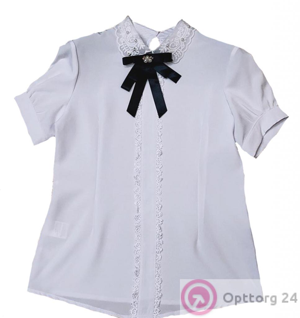Описание: Блузка для девочки с коротким рукавом белого цвета декорирована бантом. Отложенный воротничок. Застегивается сзади.