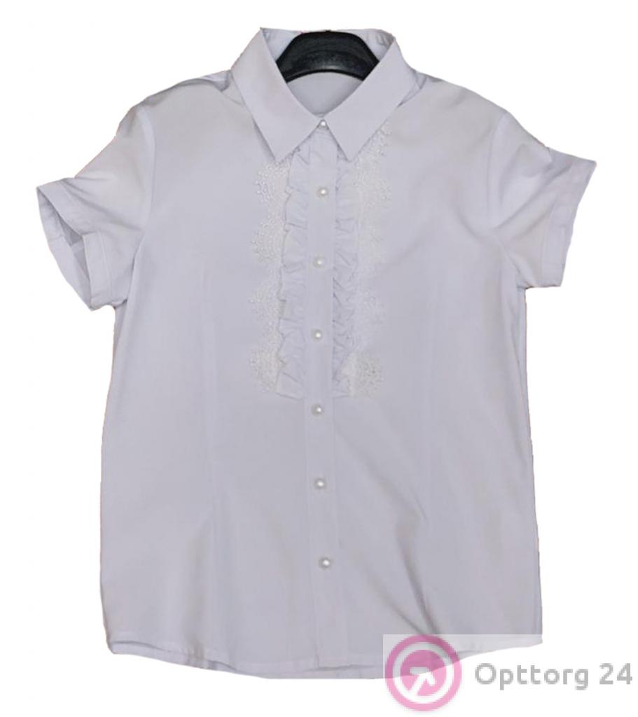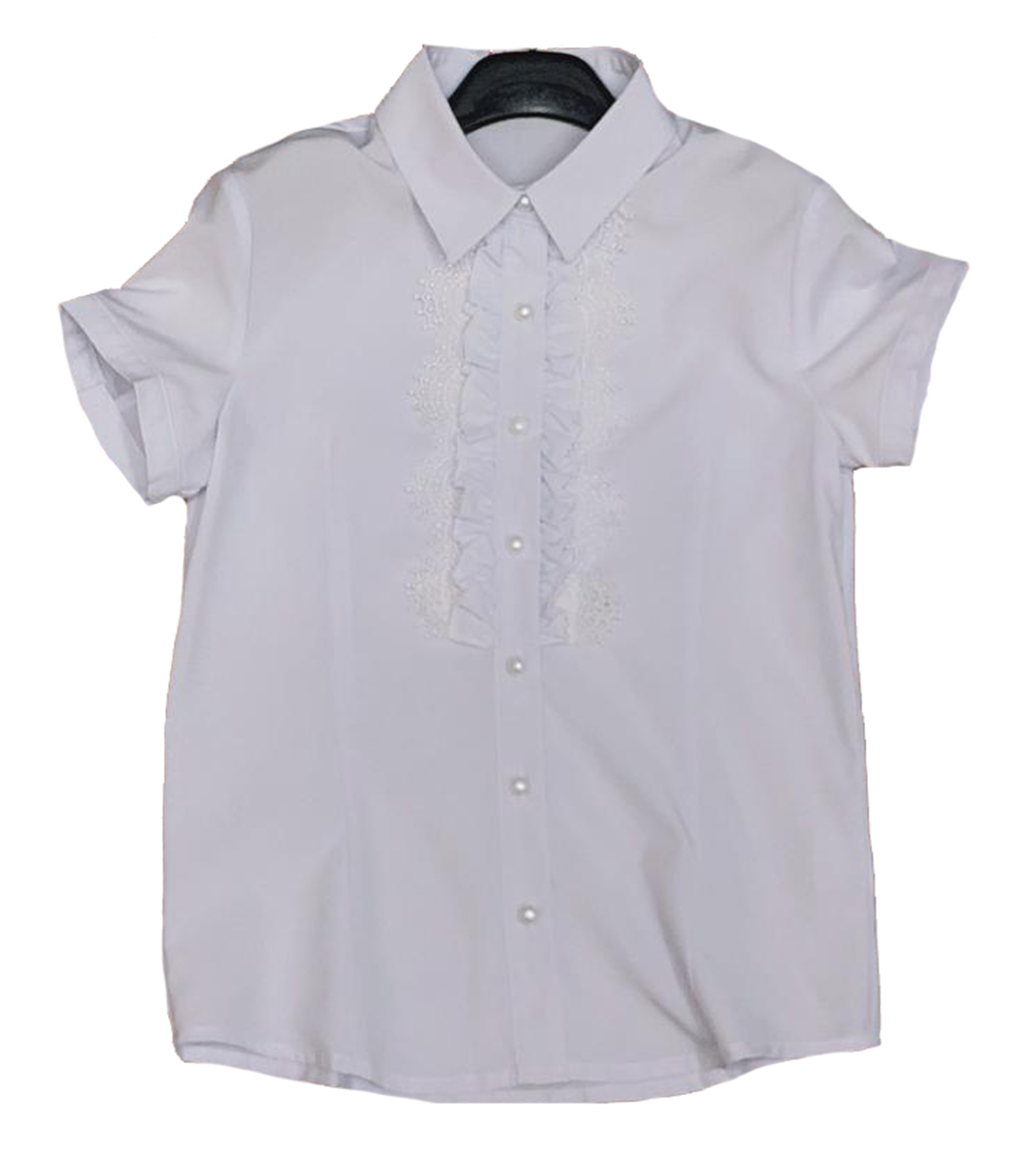Описание: Блузка для девочки с коротким рукавом, белого цвета, декорирована оборкой. Отложенный воротничок. Застегивается на ряд пуговиц.