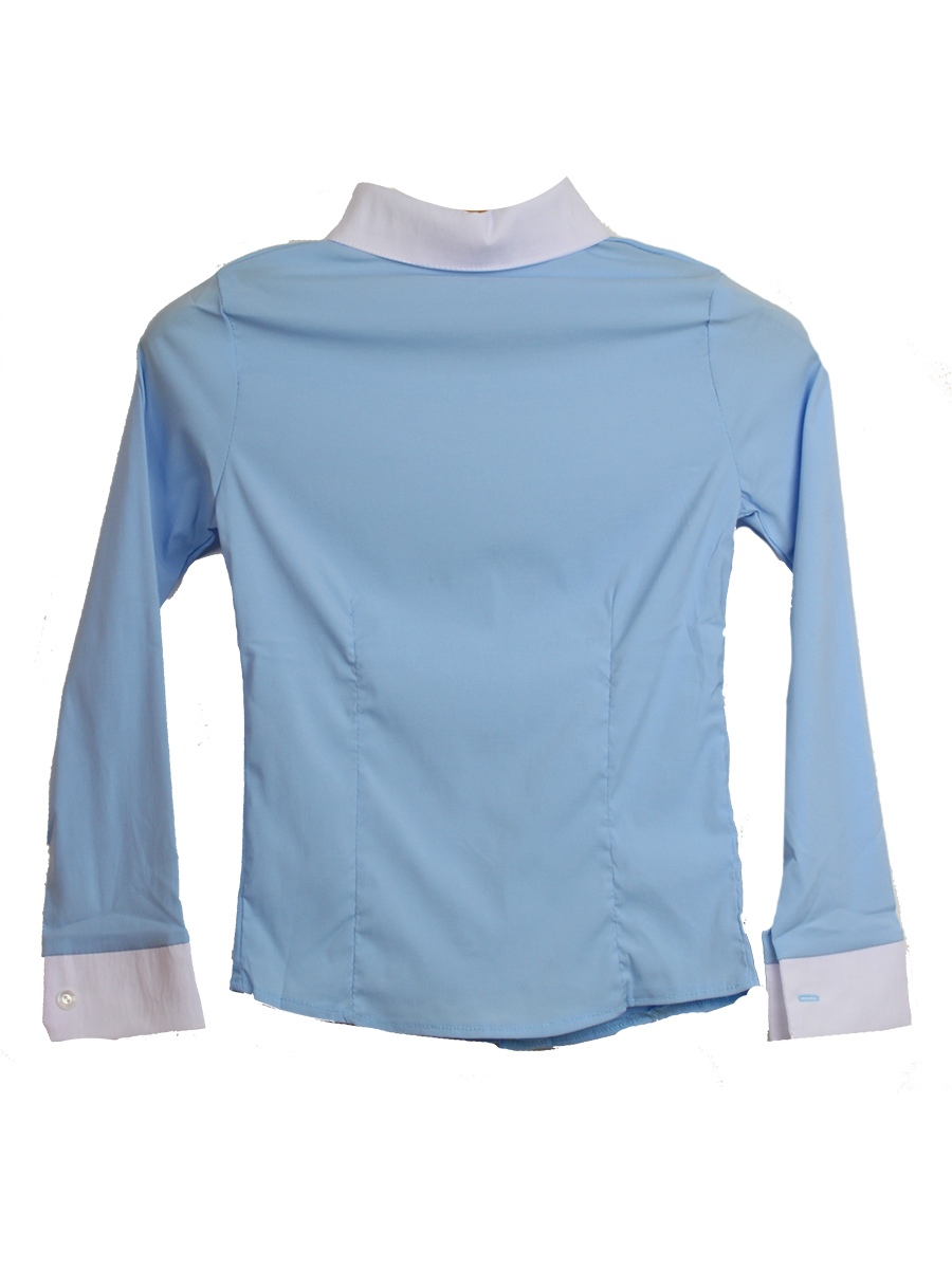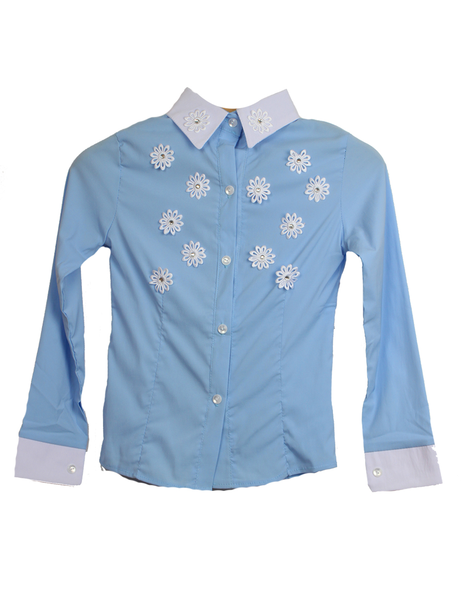 Блузка для школьницы. Стиль классический нарядный. Голубого цвета с воротом и нашивкой из цветов.