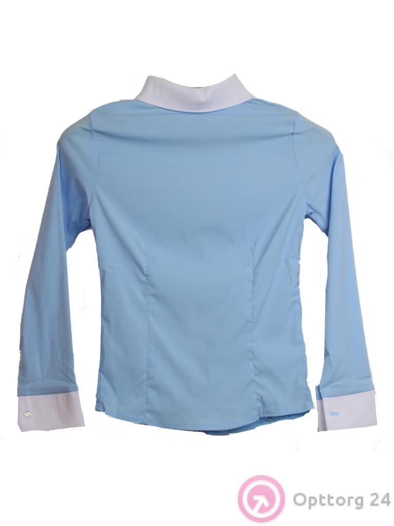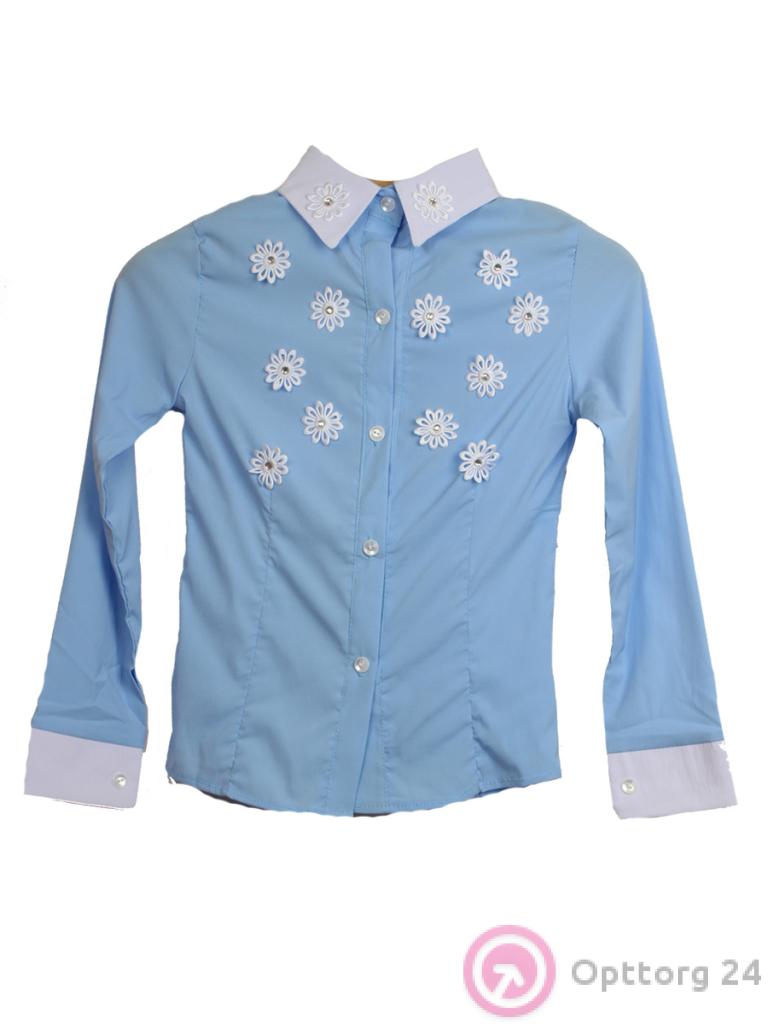 Блузка для девочки школьная голубого цвета с воротом и нашивкой из цветов оптом