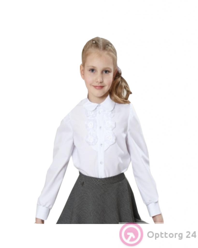 Симпатичный вариант школьной блузы белого цвета. Оригинальности изделию придает нежное оформление рюшами вдлоль линии пуговиц спереди.