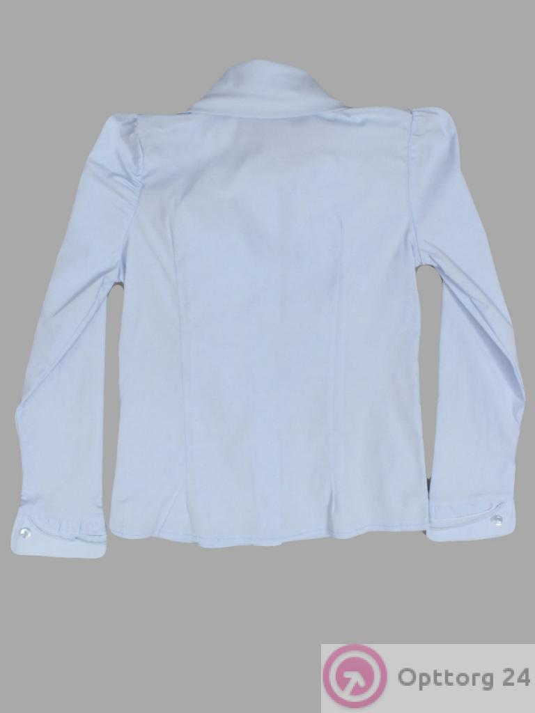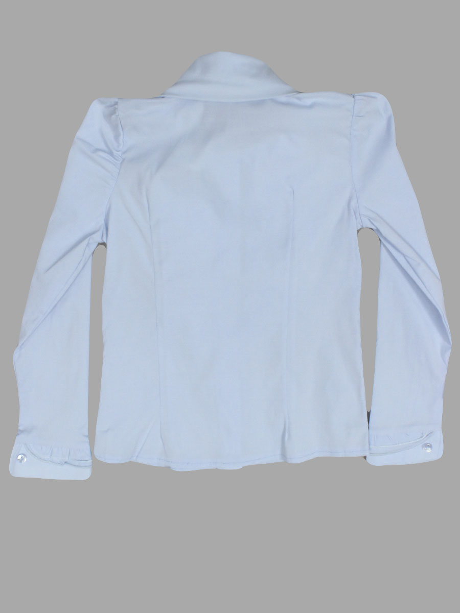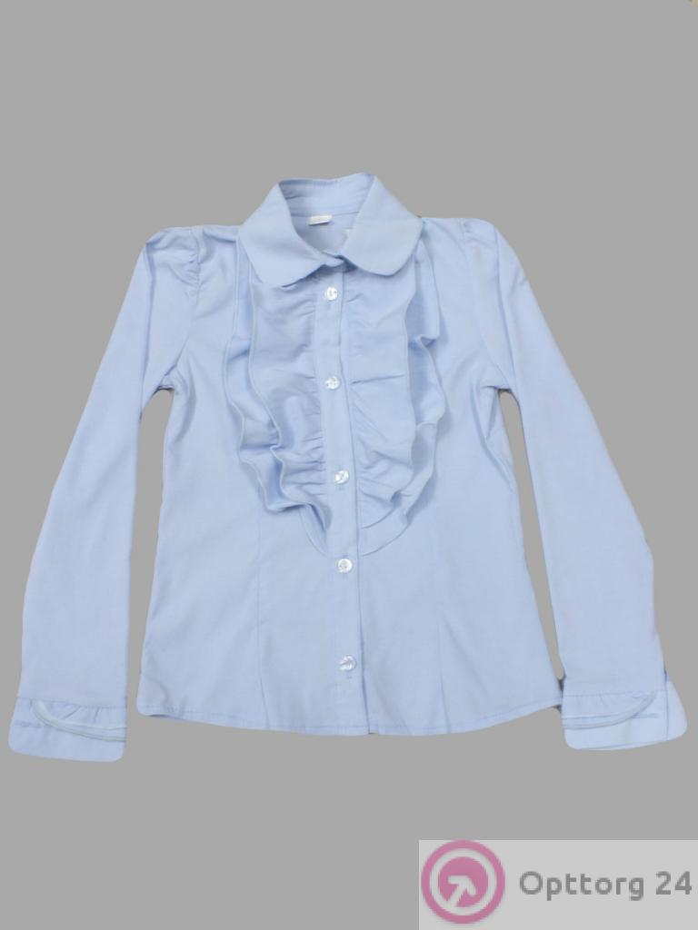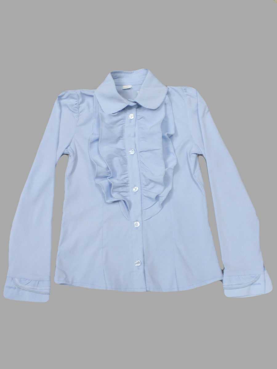 Детская школьная блузка голубого цвета с пышным волнистым рюшем.