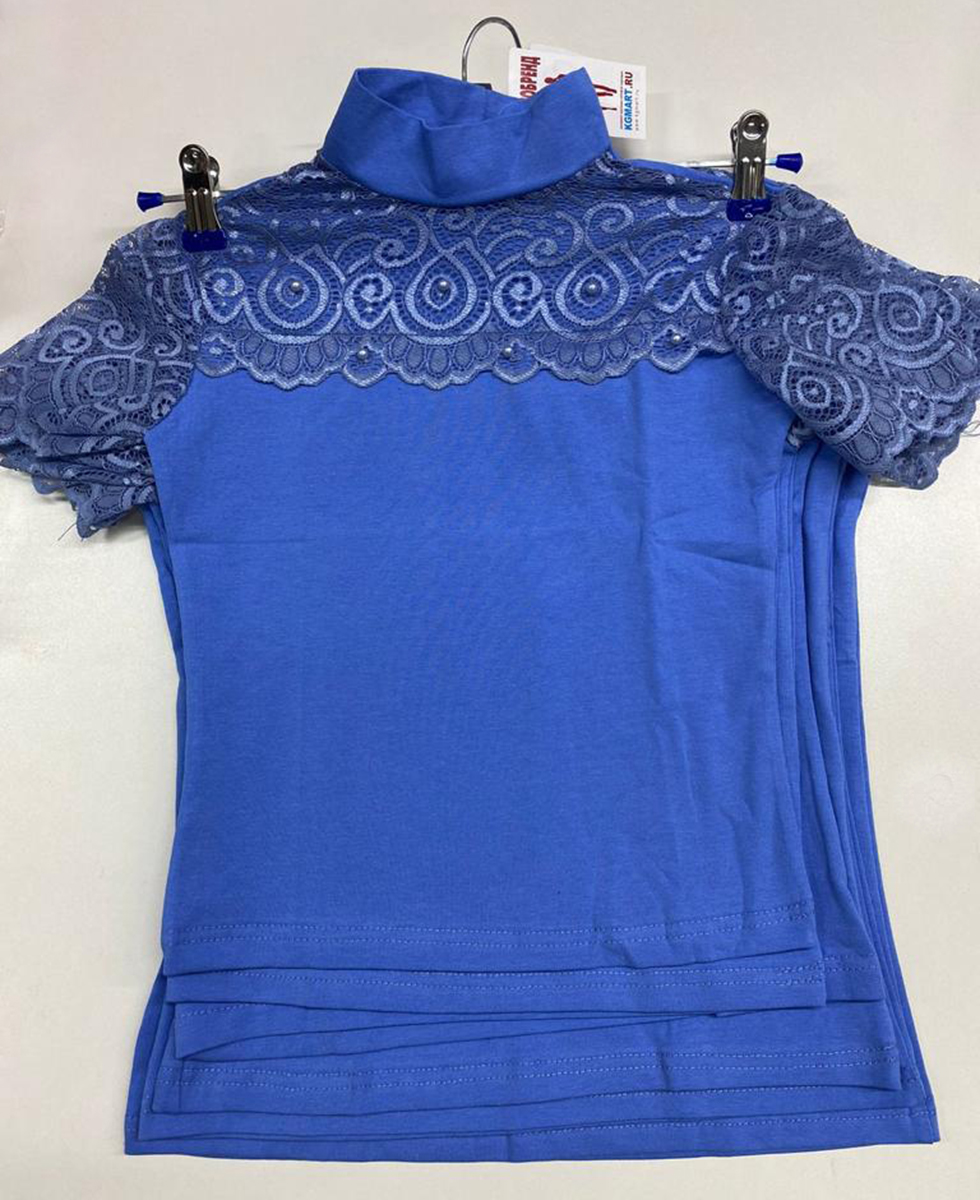 Описание: Блузка школьная трикотажная для девочки с коротким рукавом, василькового цвета декорирована кружевом и жемчужинами. Воротничок стоечка.