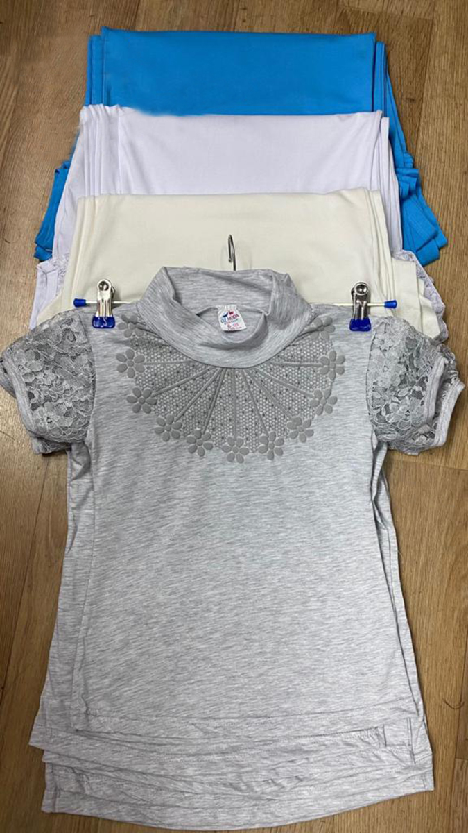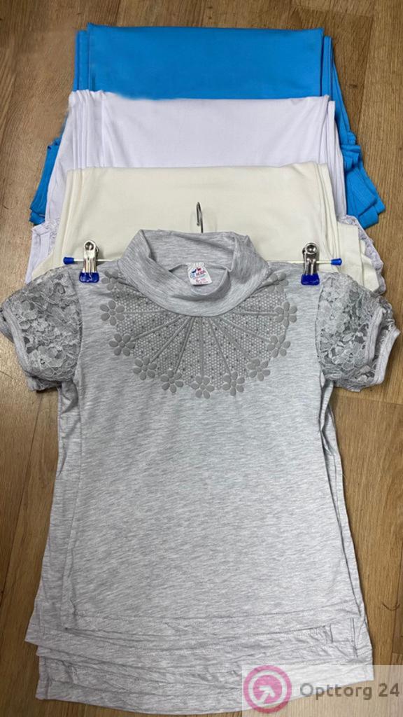Описание: Блузка трикотажная школьная для девочки с коротким рукавом, с принтом цветов, однотонная. Рукава выполнены из гипюра.