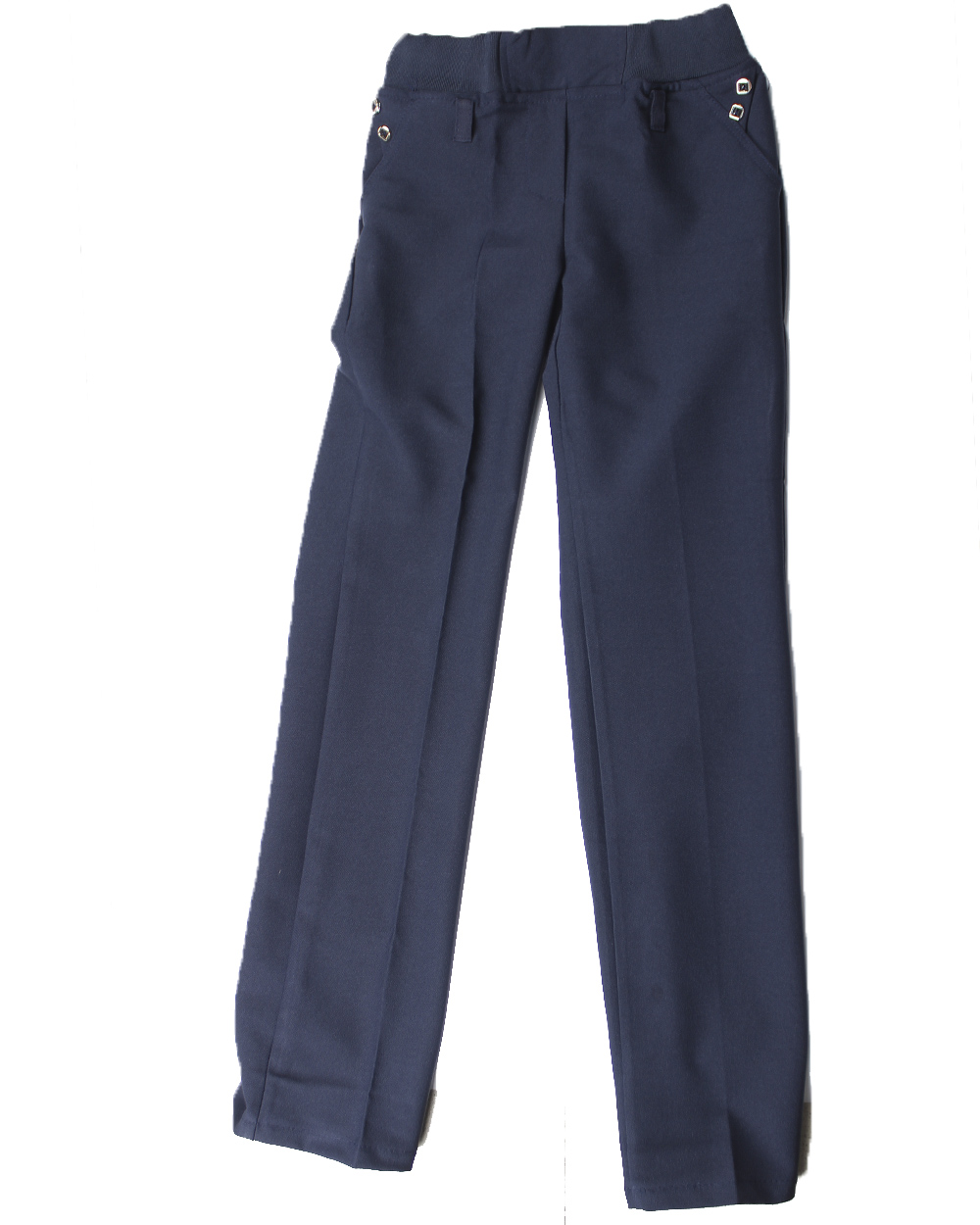 Брюки школьны для девочек синего цве на резинке с украшением на карманах.