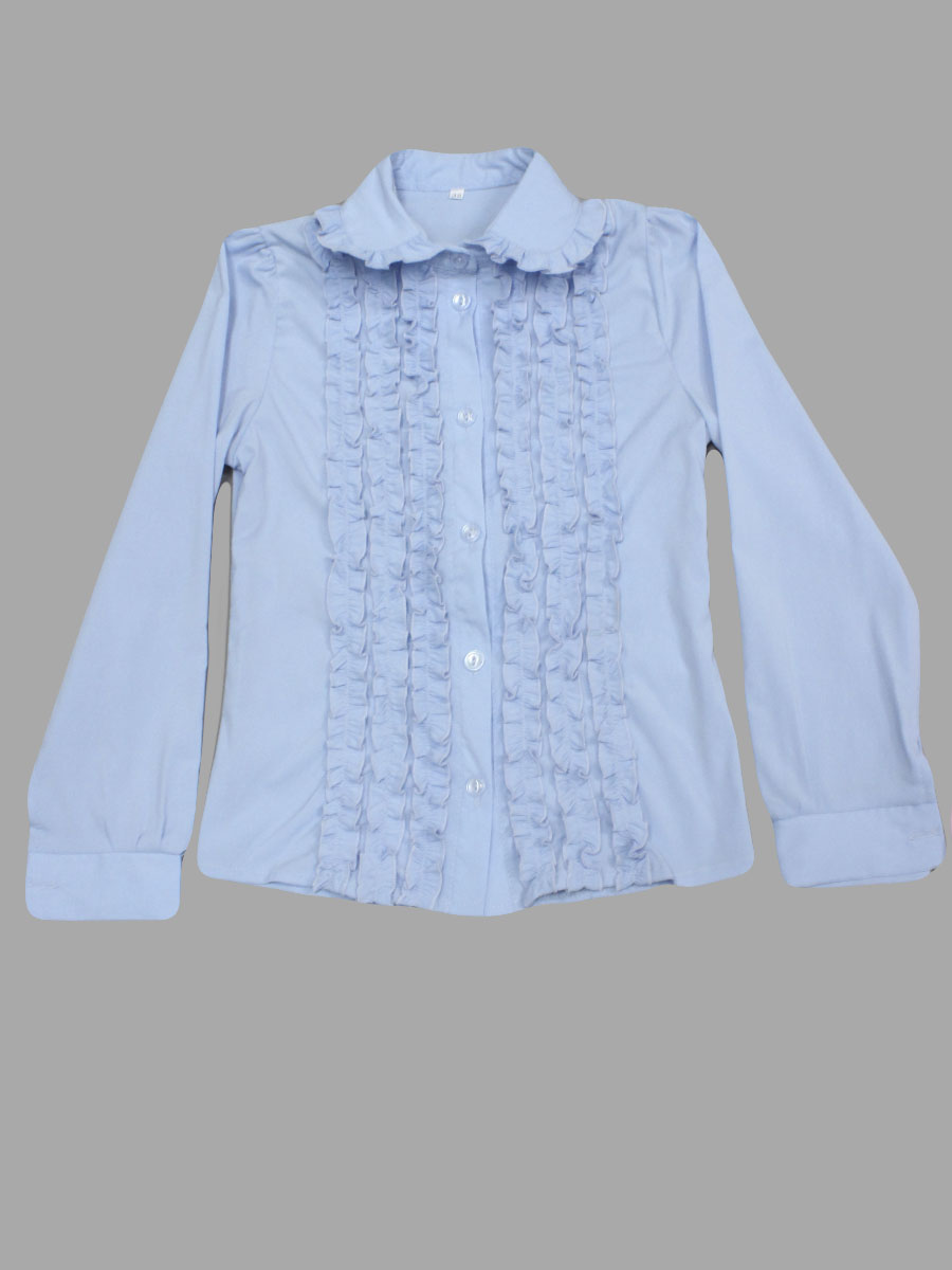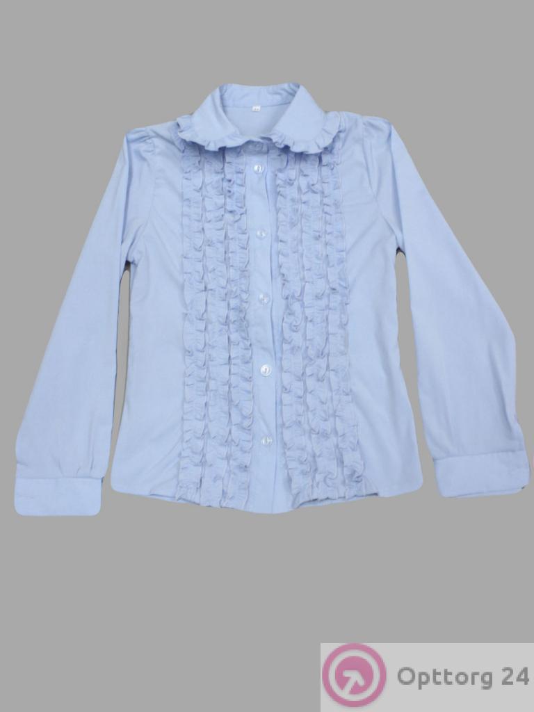 Детская блузка для девочки модель голубого цвета с рюшем на передней части изделия..