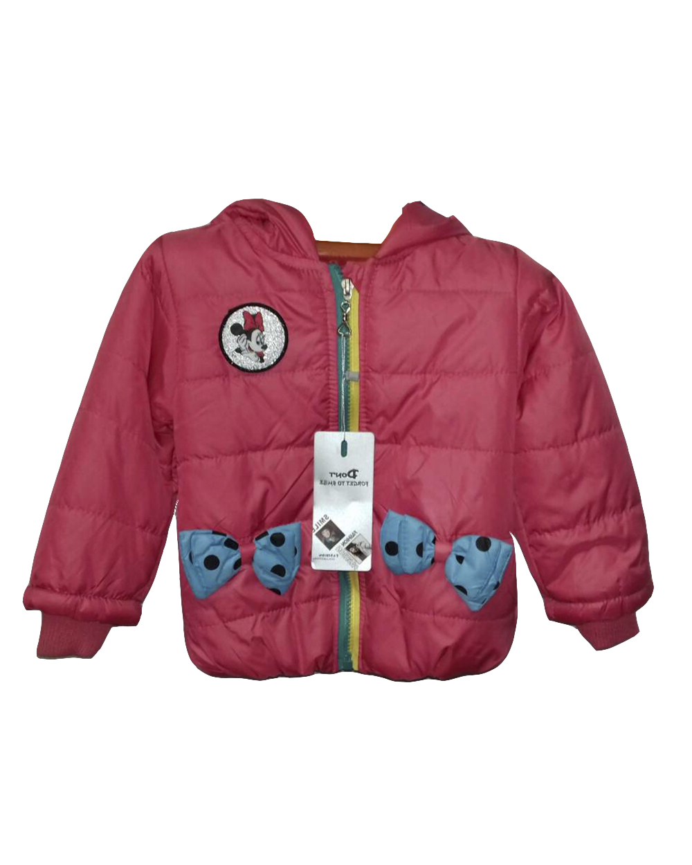 Симпатичная детская курточка с капюшоном и ушками. Спереди модель украшена двумя голубыми бантиками. Ткань хорошо стирается и не деформируется.
