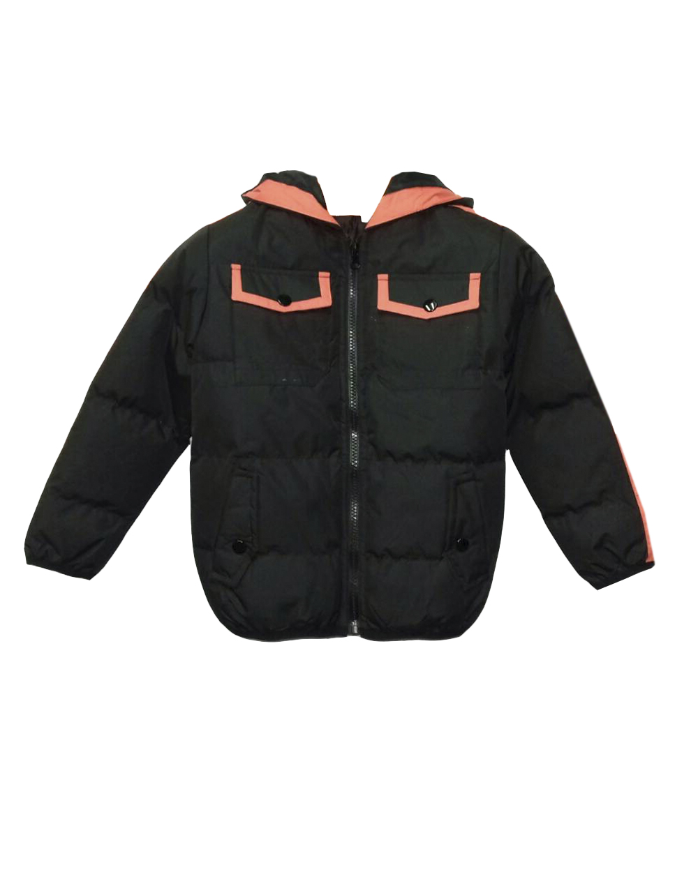 Куртка детская со слегка зауженным к низу силуэтом. Модель дополнена капюшоном, которые не отстегивается. Также в изделии есть нагрудные карманы, с контрастной окантовкой красного цвета.