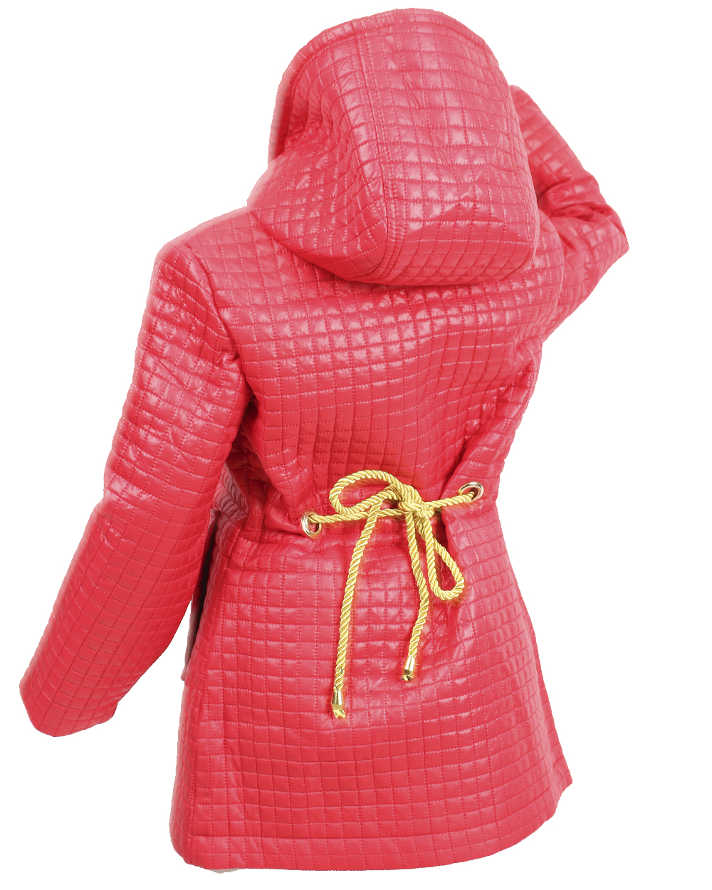 Детская куртка красного цвета. Стёганная модель на кнопка с золотистой завязкой.