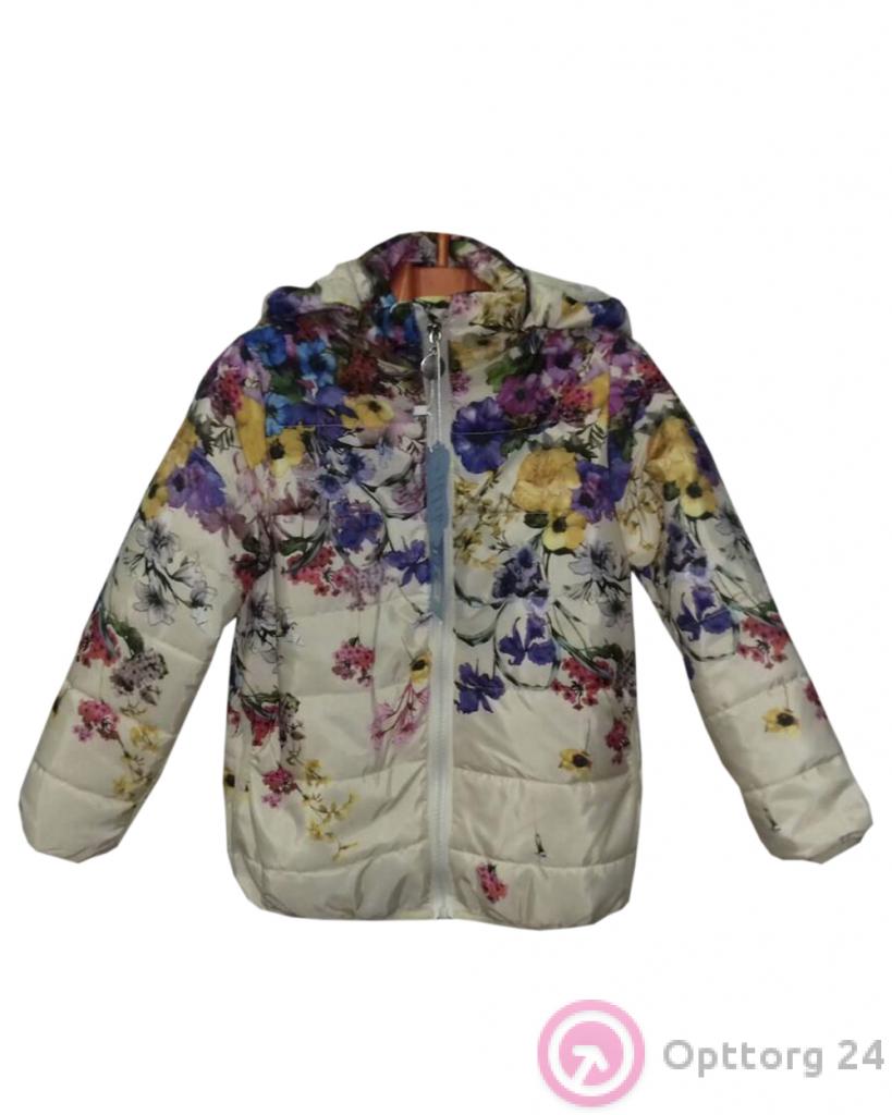 Эффектная стеганная курточка молочного цвета с россыпью цветов. В модели есть капюшон и воротник-стойка.