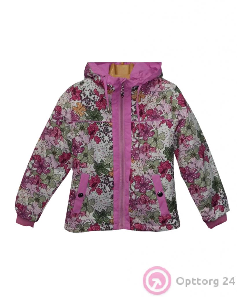 Цветастая детская куртка с карманами на заклепках. Застегивается модель за молнию. Капюшон утягивается с помощью шнурка.