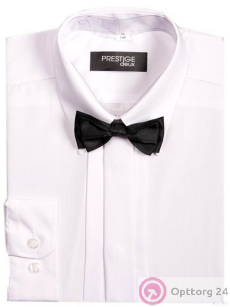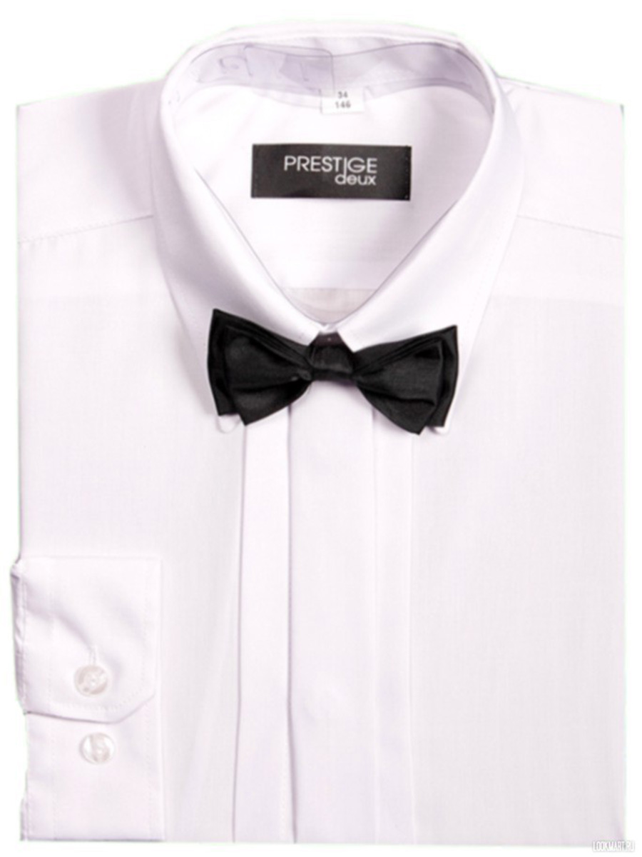 Сорочка детская для торжества модель белого цвета с черным галстуком-бабочкой.