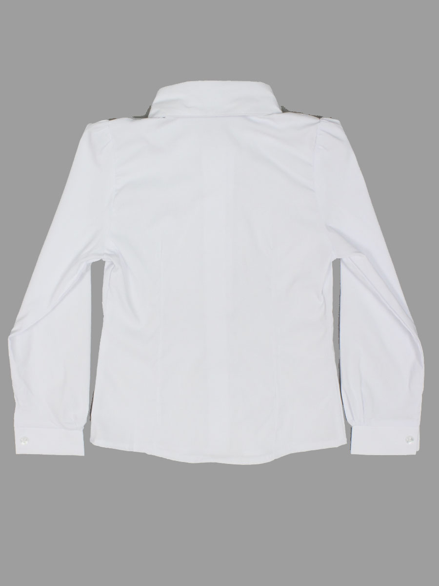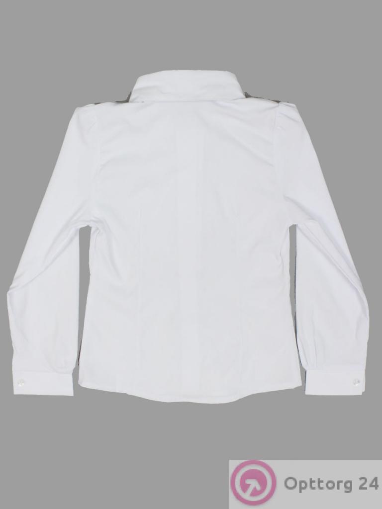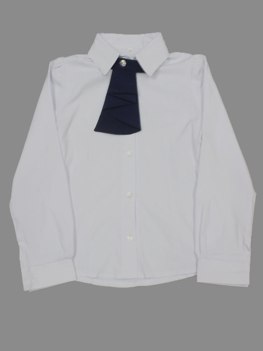 Блузка для девочки, школьная форма, модель белого цвета с синим полугалстуком на резинке.