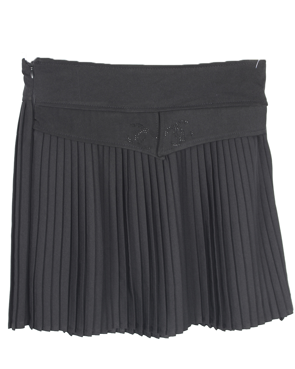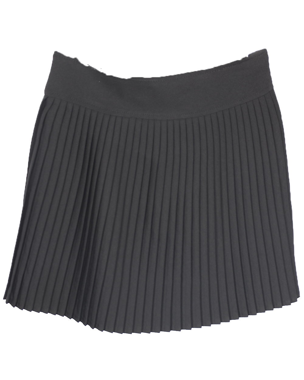 Юбка детская черного цвета в мелкую складку. Модель с перфорированым значком на передней части изделия.