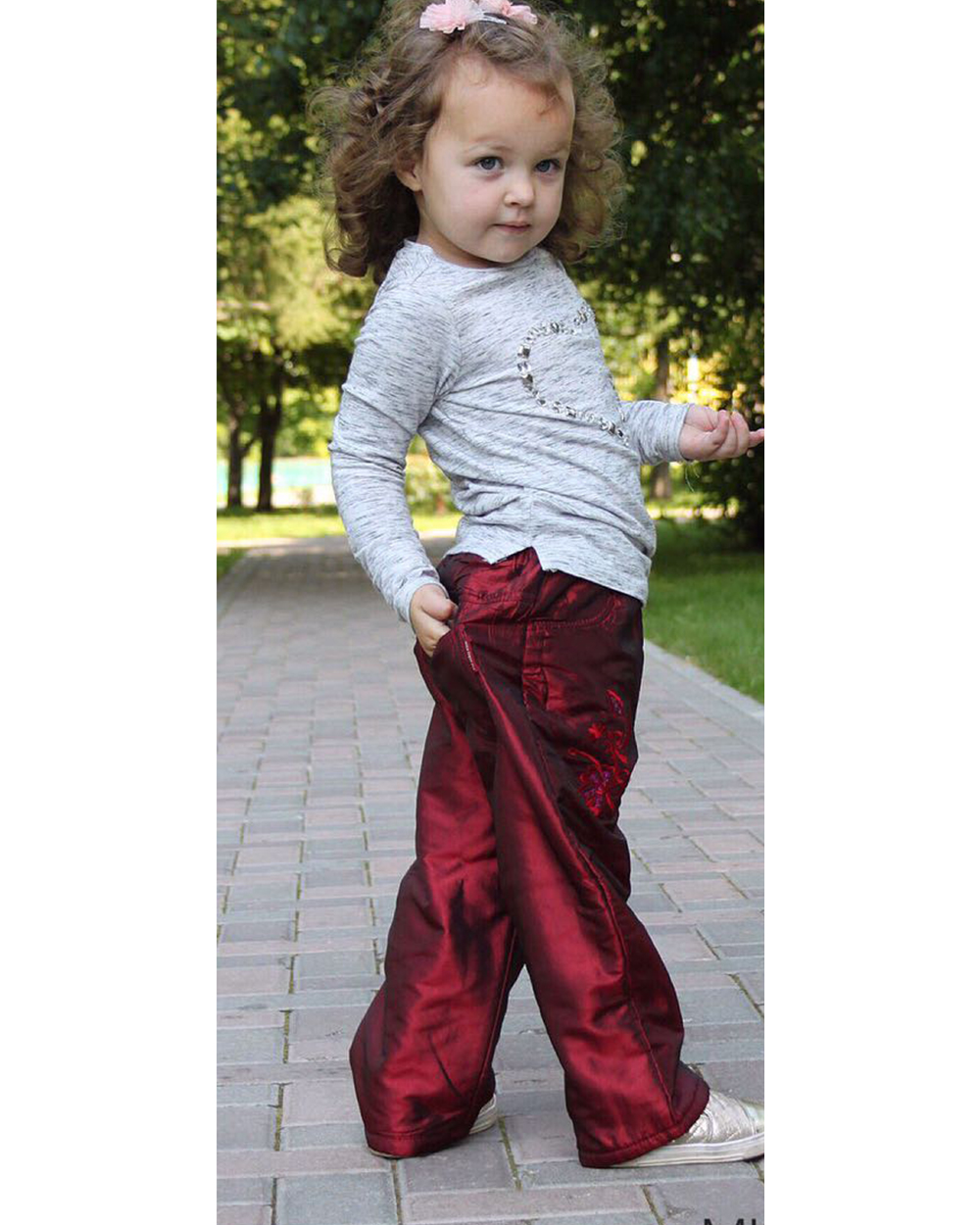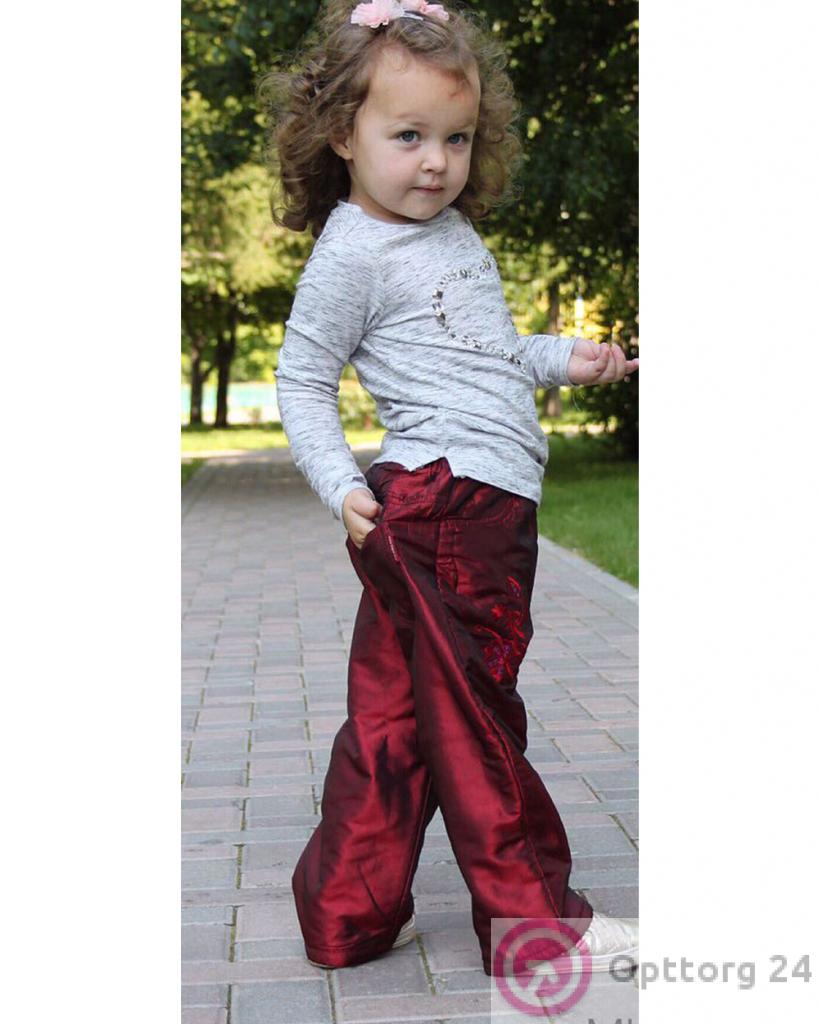 Теплые детские штанишки бордового цвета, Внутри с начесом. Держаться на вшитой резинке. Прямой крой, спереди есть аккуратная вышивка в виде цветков.