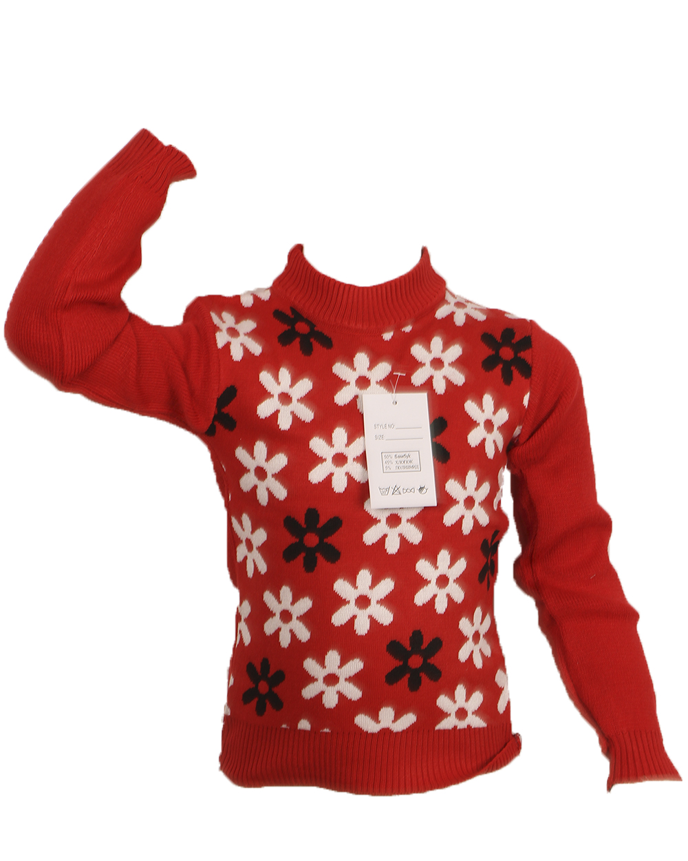 Джемпер детский красного цвета с принтом в виде снежинок черного и белого цвета.