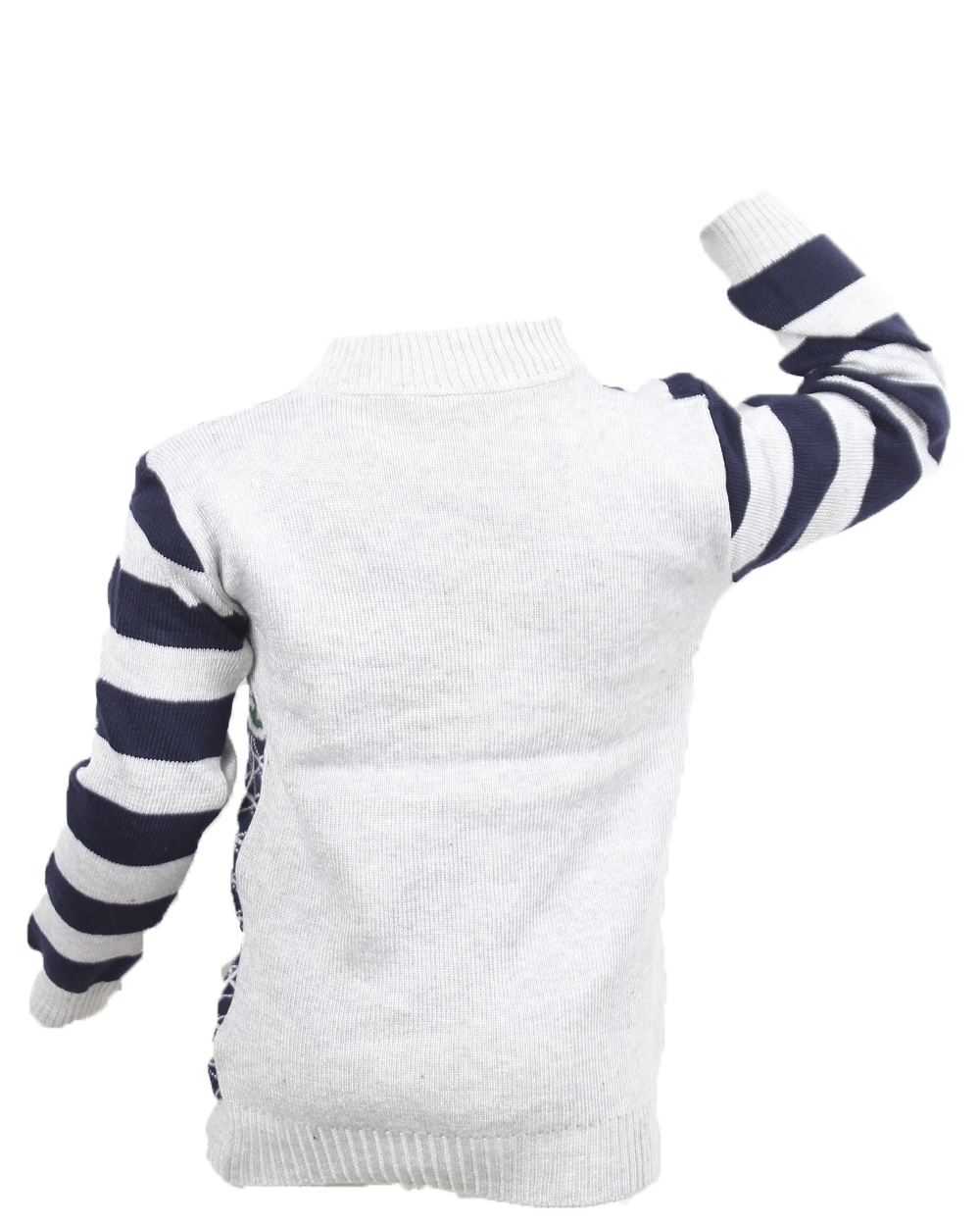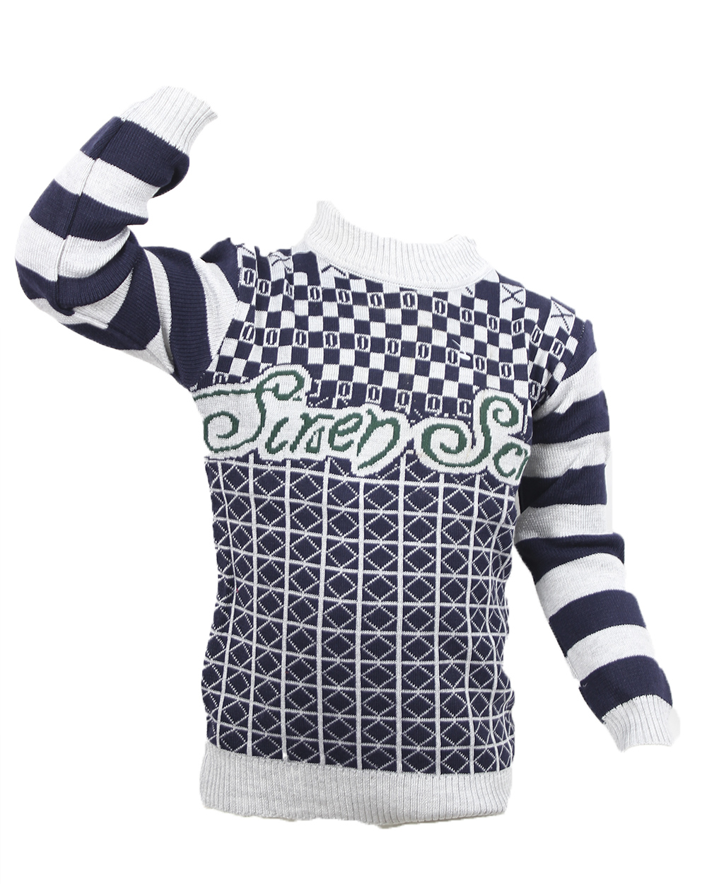 Детский джемпер серо-синего цвета в мелкий кубик с надписью на передней части изделия.