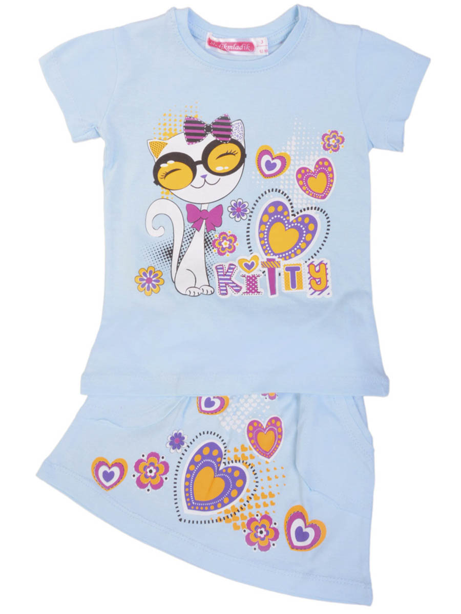 Комплект для девочки, модель юбка+футболка голубого цвета с принтом.