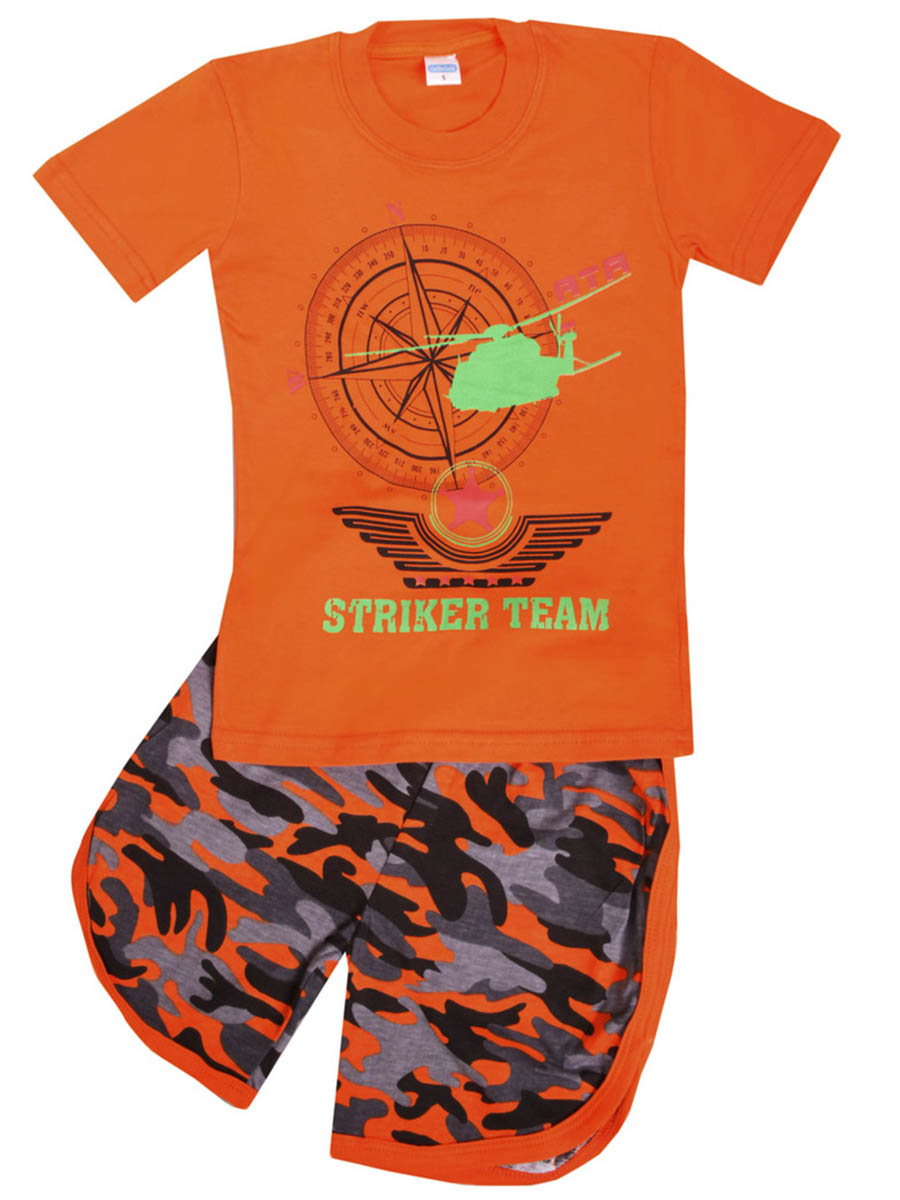 ДДетский комплект для мальчика футболка + шорты оранжевого цвета с рисунком.