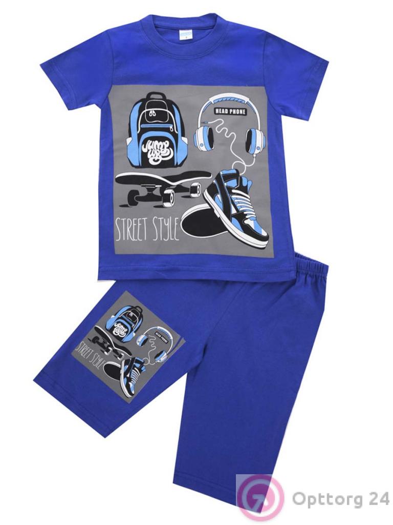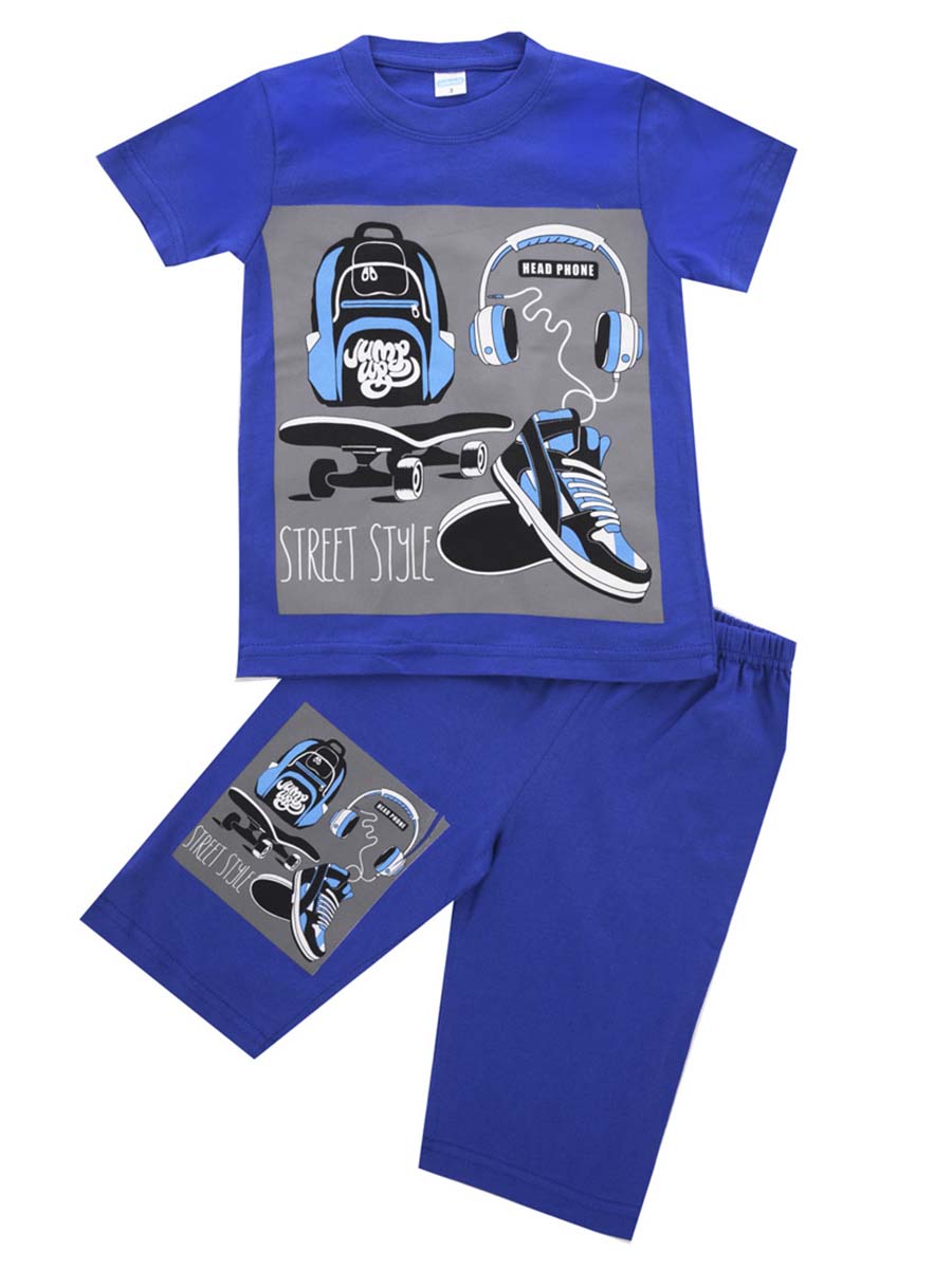 Костюм двойка для мальчика футболка + шорты, модель синего цвета с принтом.
