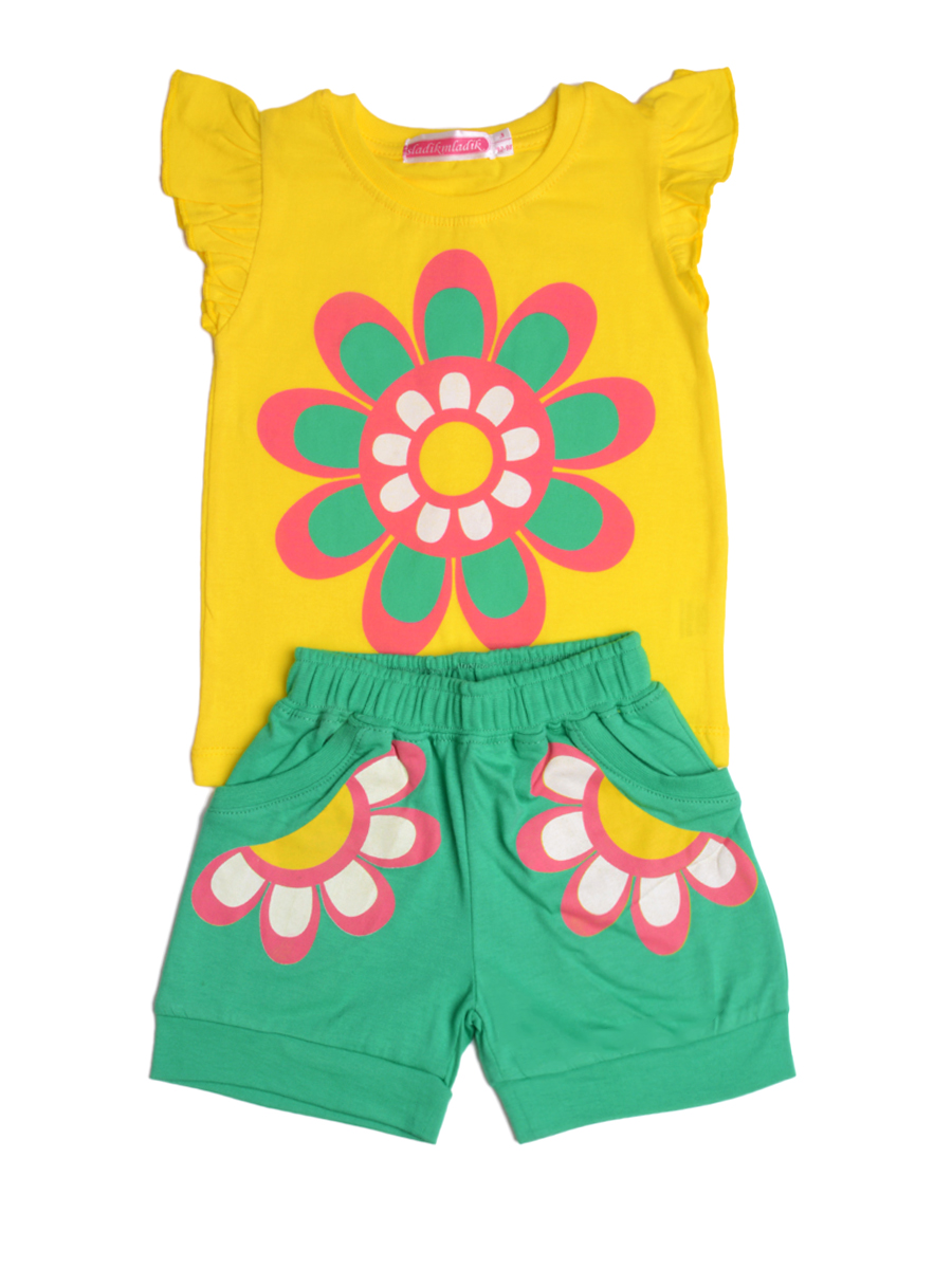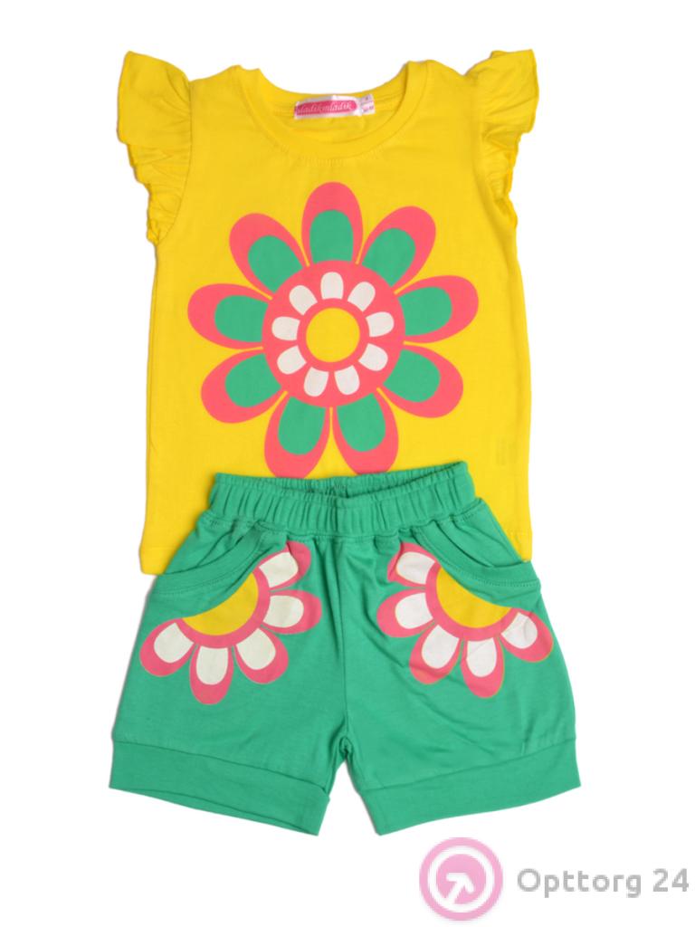 комплект для девочки желтая футболка+ зеленые шерты, с принтом в виде цветка.