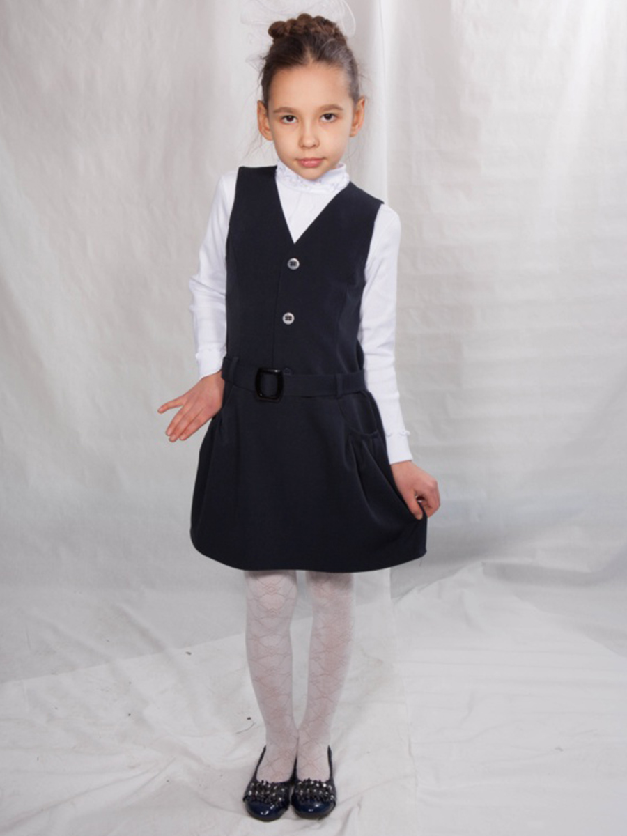 Сарафан школьный для девочки модель черного цвета с ремнём и пуговицами.