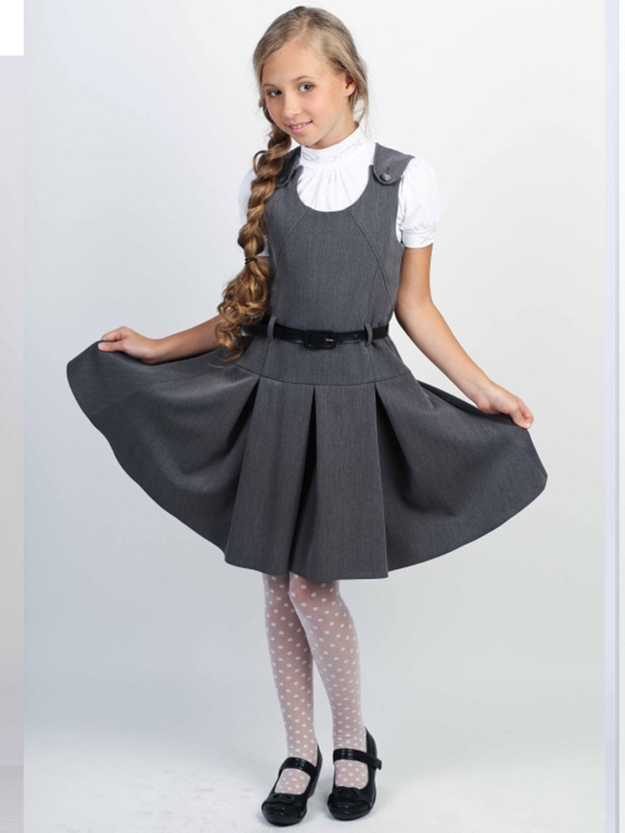 Сарафан для девочки, Модель серого цвета на лямках с ремнем и пышной юбкой.