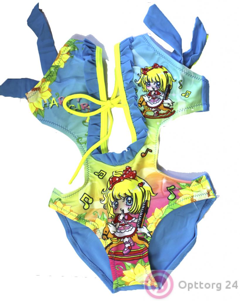 Детский купальник гоубого цвета. Слитная модель с нанесённым принтом в виде девочки мультяшки.