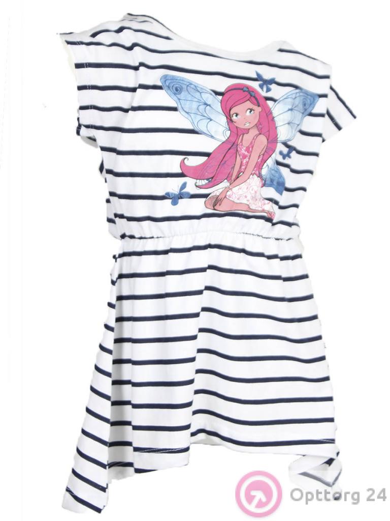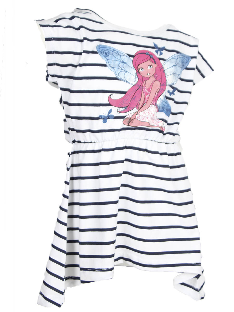 Детское платье белого цвета в черную полоску. На переднюю часть изделия нанесен принт.