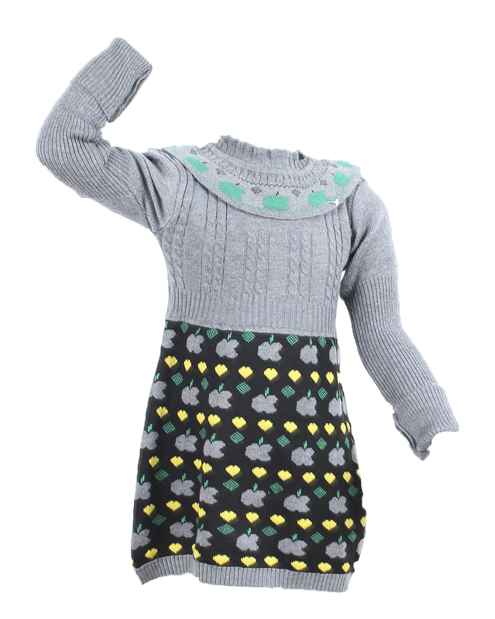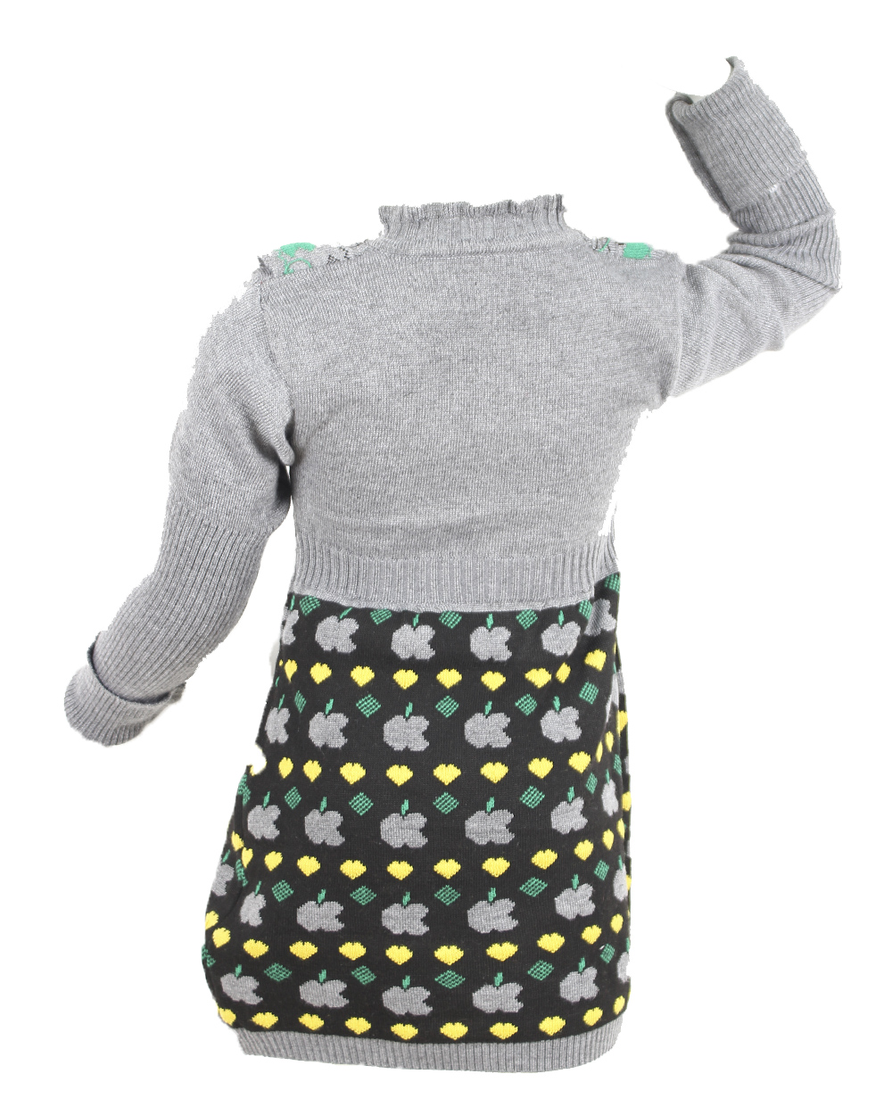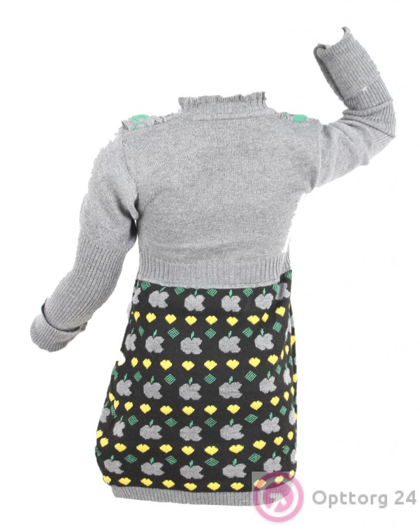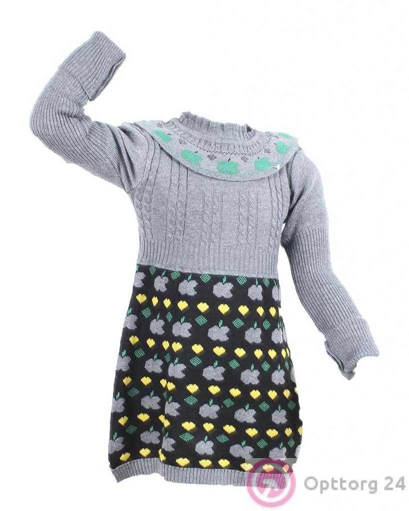 Детское платье-джемпер серого цвета с черной юбкой с принтом в виде яблок.