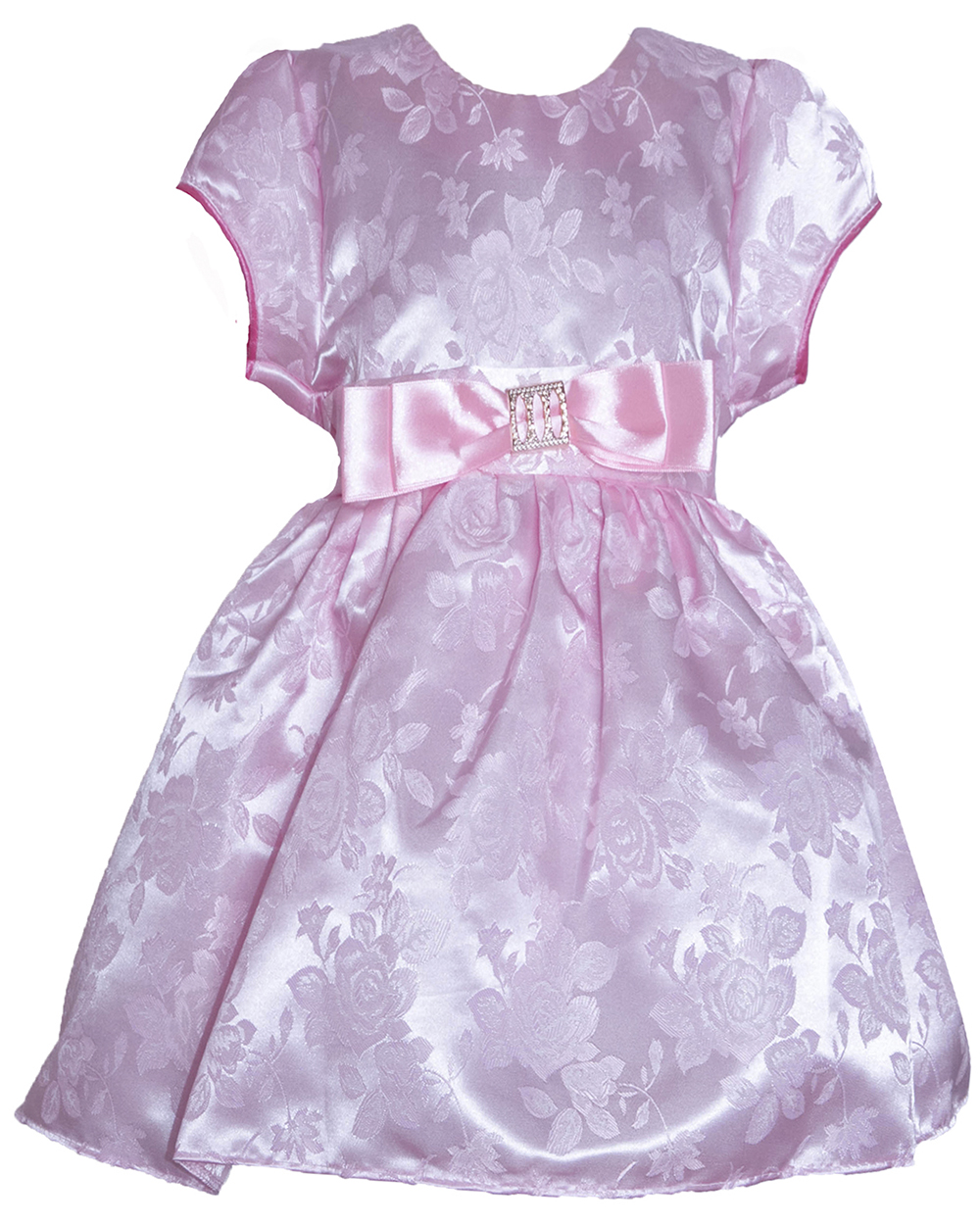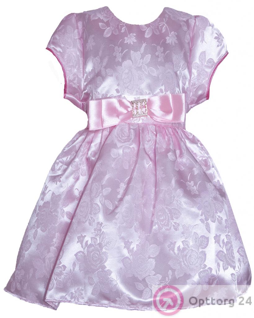 Нарядное детское платье, приятного мягкого розового цвета. Сепереди украшением служит симпатичный бант. Высококачественный полиэстер легко стирается. Подкладка выполнена из натурального, приятного для тела хлопка.