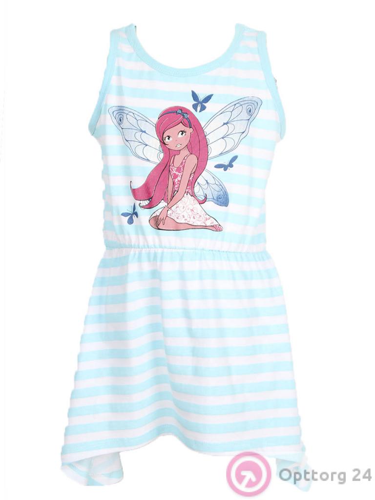 Детское платье бело голубого цвета с принтом в виде феи на передней части изделия.