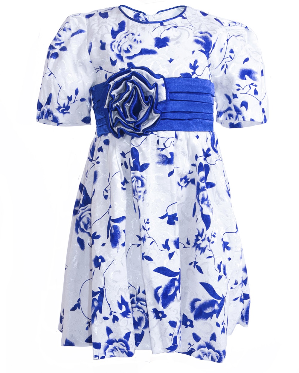 Изысканное современное платье с цветочным принтом. В изделии есть пояс контрастного синего цвета, который украшен оборками и объемным цветком. Модель станет одной из самых любимых вещей в гардеробе вашей девочки.