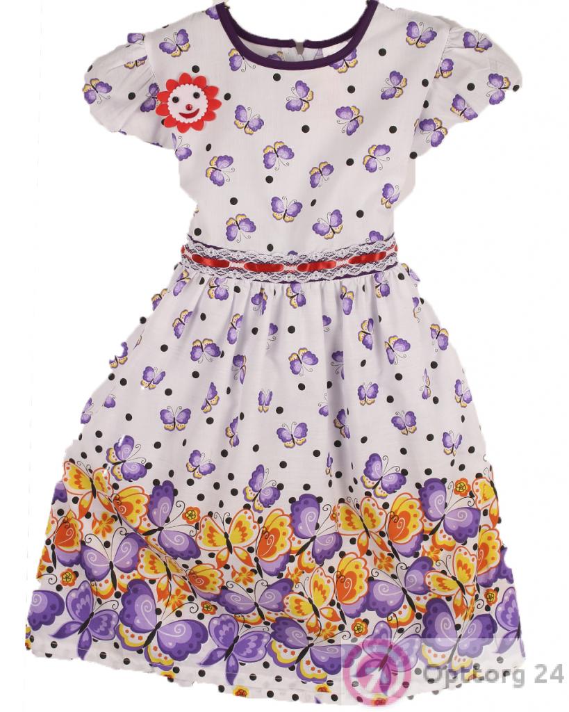 Детское платье белого цвета с фиолетовыми бабочками и черным горохом. оптом