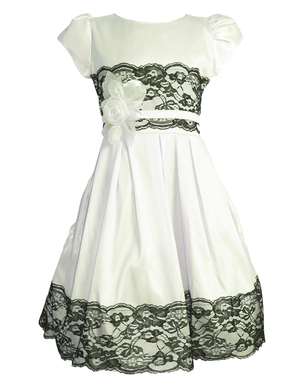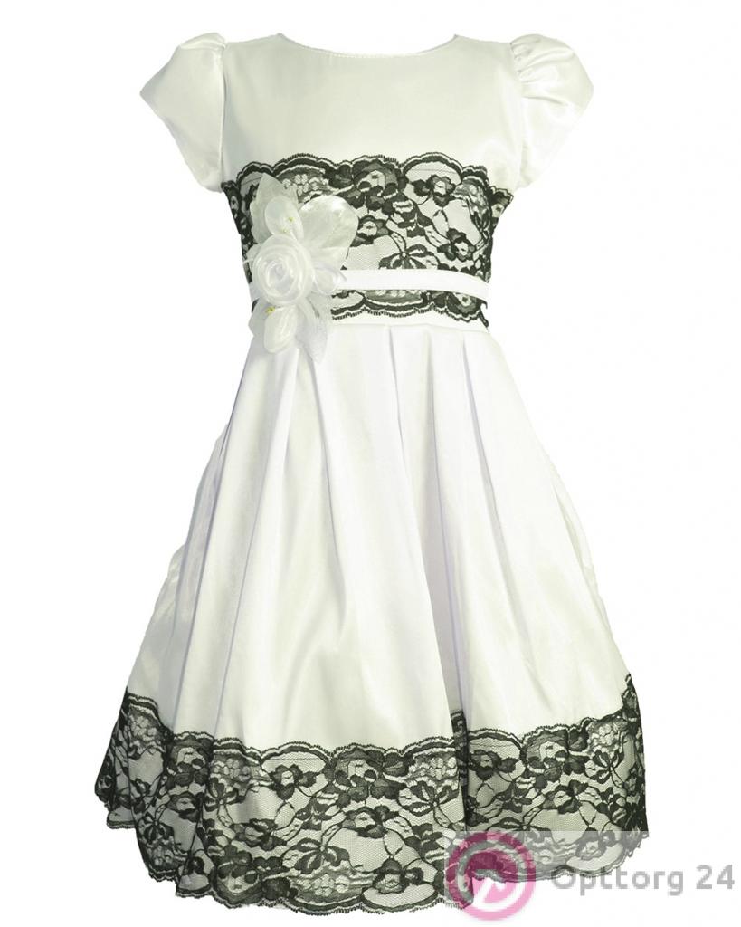 Оригинальное детское платье белого цвета. Очень стильно и богато смотрятся черные контрастные гипюровые вставки. По линии талии идет тонкая атласная полоска.