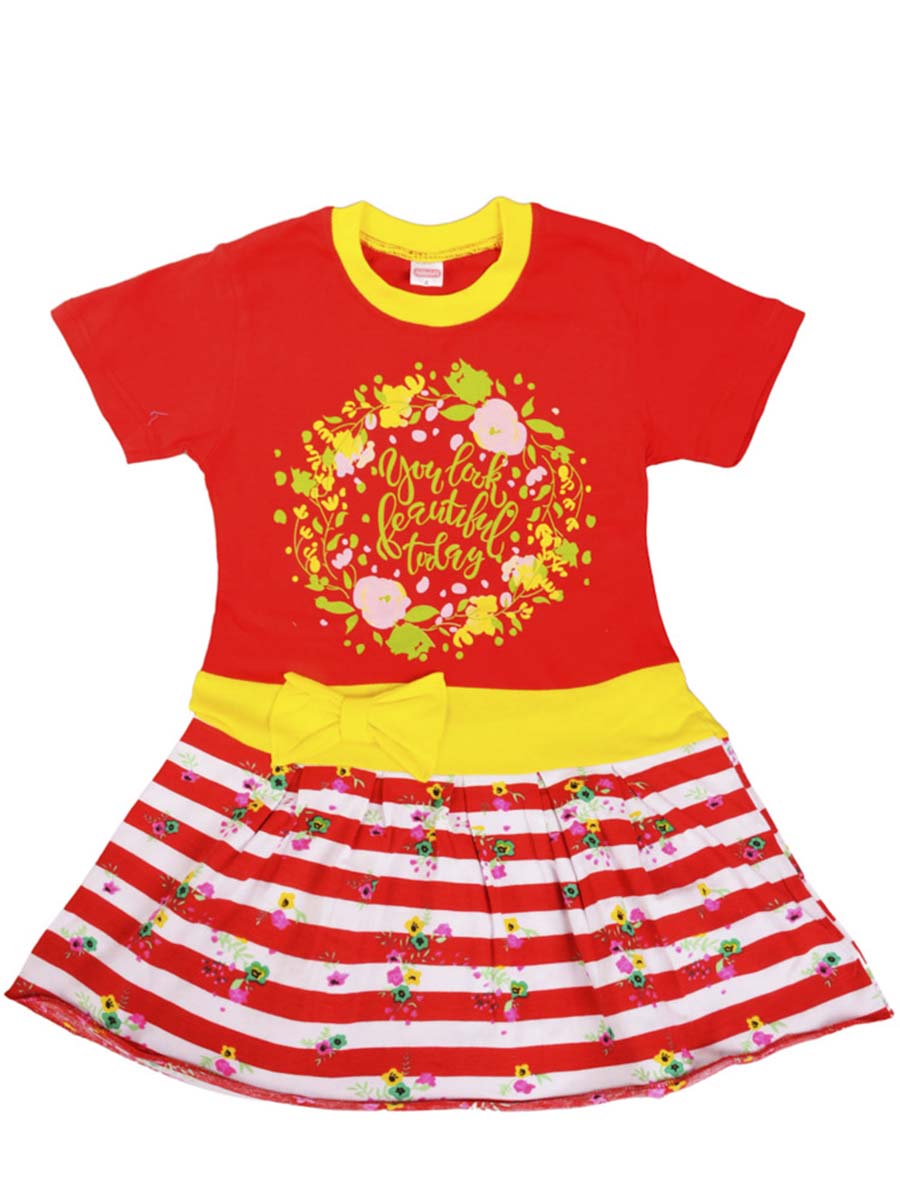 Платье детское красного цвета с принтом на передней части изделия.