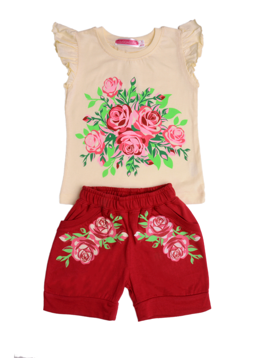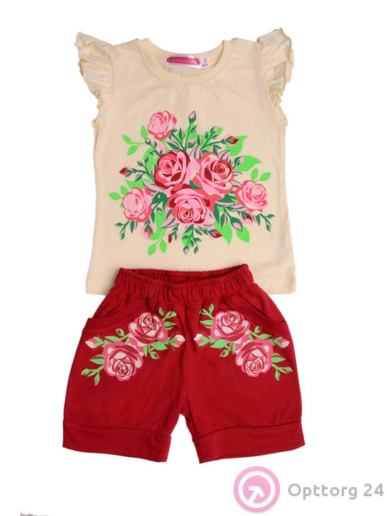 омплект для девочки бежевого цвета с красными шортами. модель с принтом в области груди.