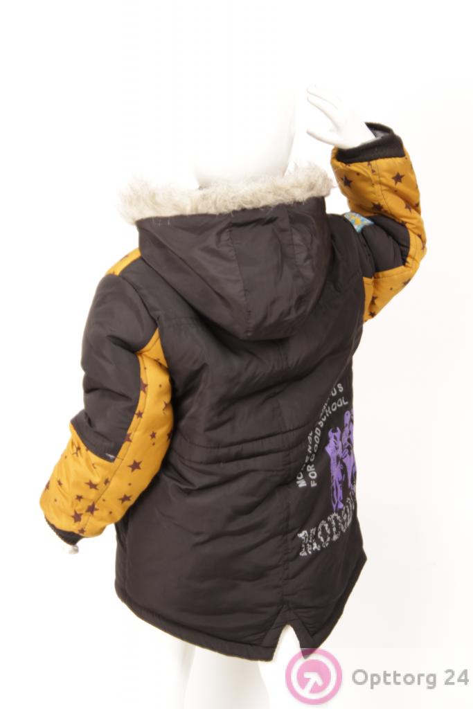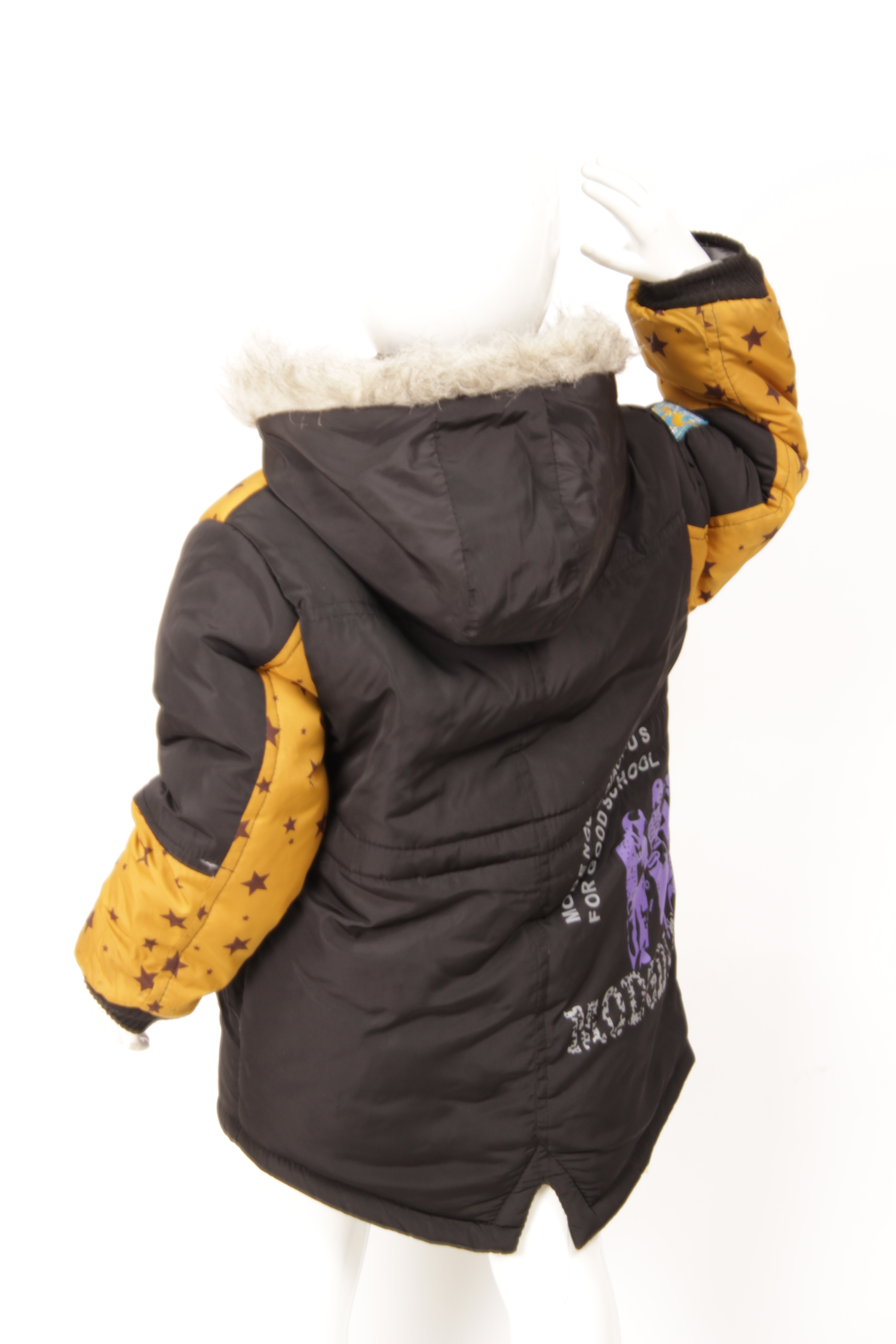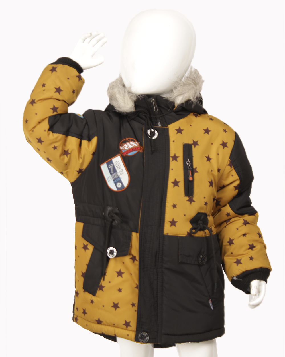 Детский двухцветный пуховик для мальчика. Черно-жёлтая модель украшенна принтом в виде звезд. Цвета в асортименте: Черный/жёлтый Хаки/голубой.