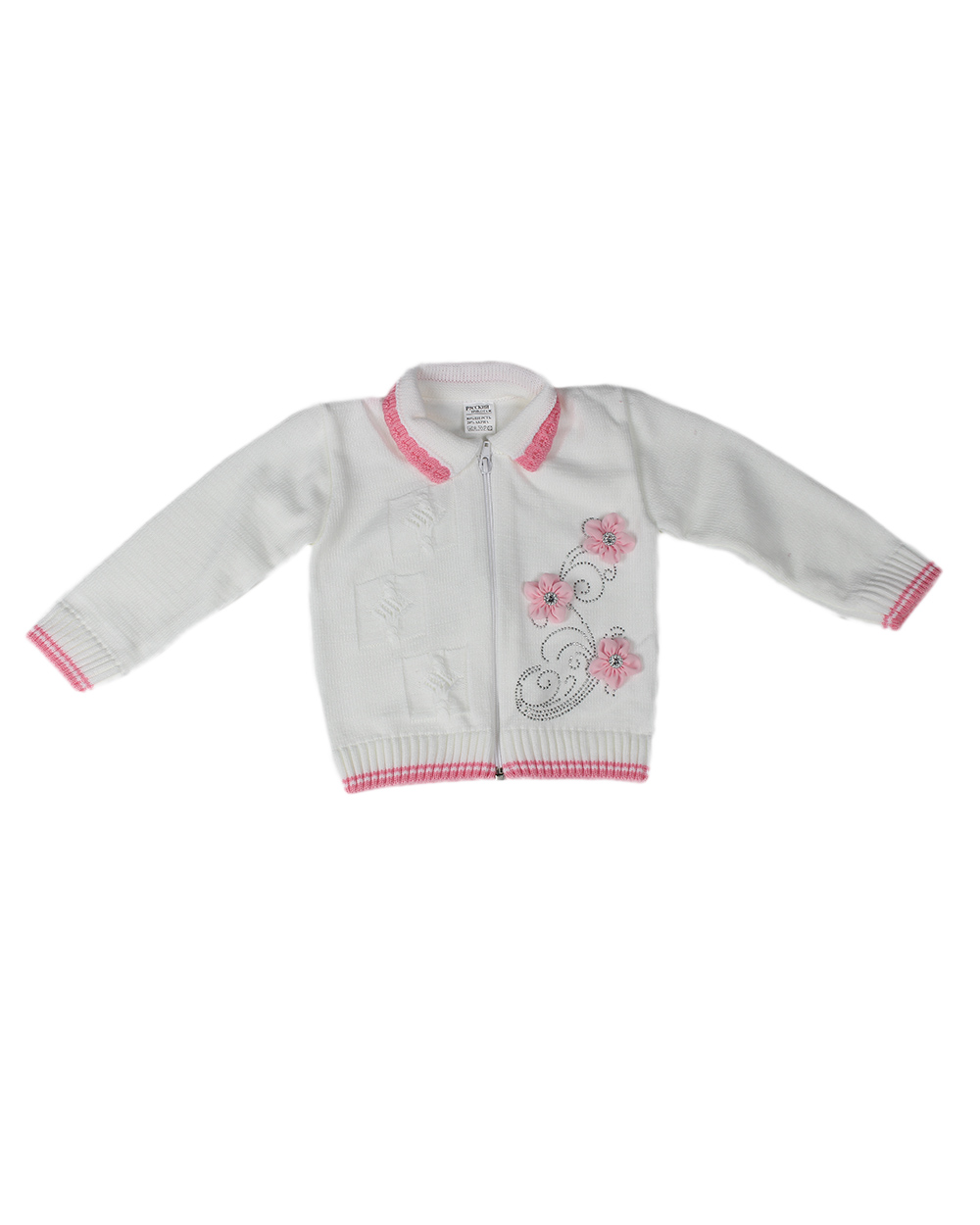 Детский джемпер белого цвета с нежными розовыми цветами. Застегивается модель на молнию.