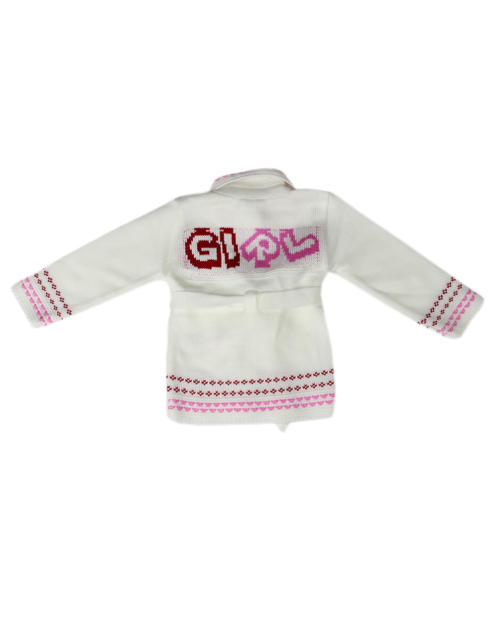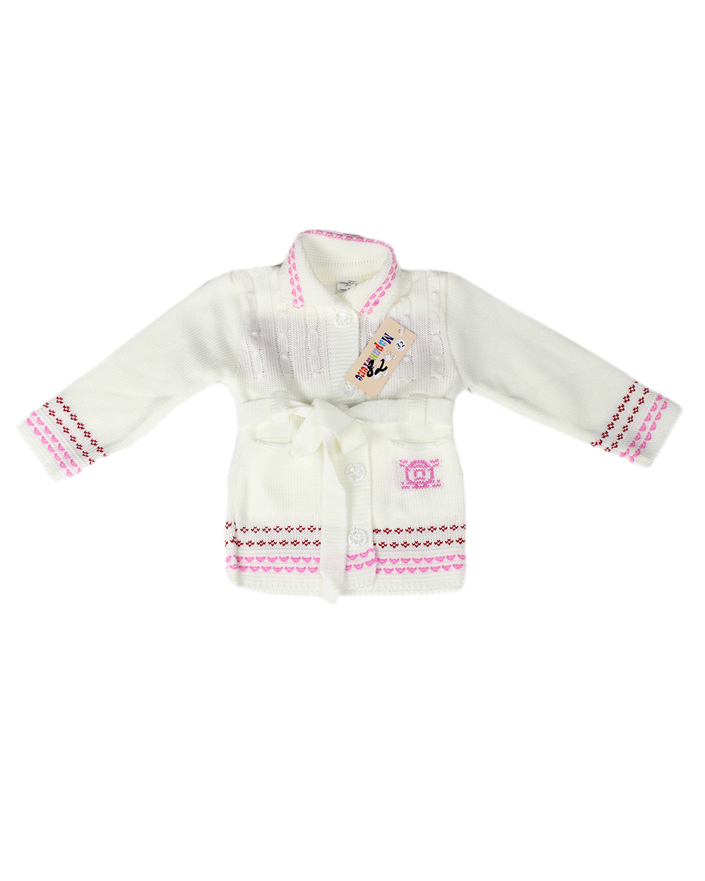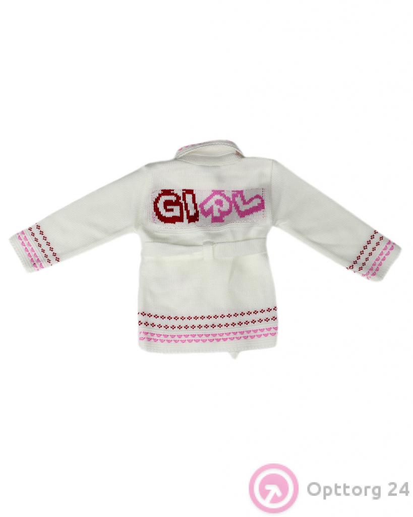 Детский джемпер белого цвета с нежным рисунком розового цвета. Изделие имеет вязаный пояс в комплекте.