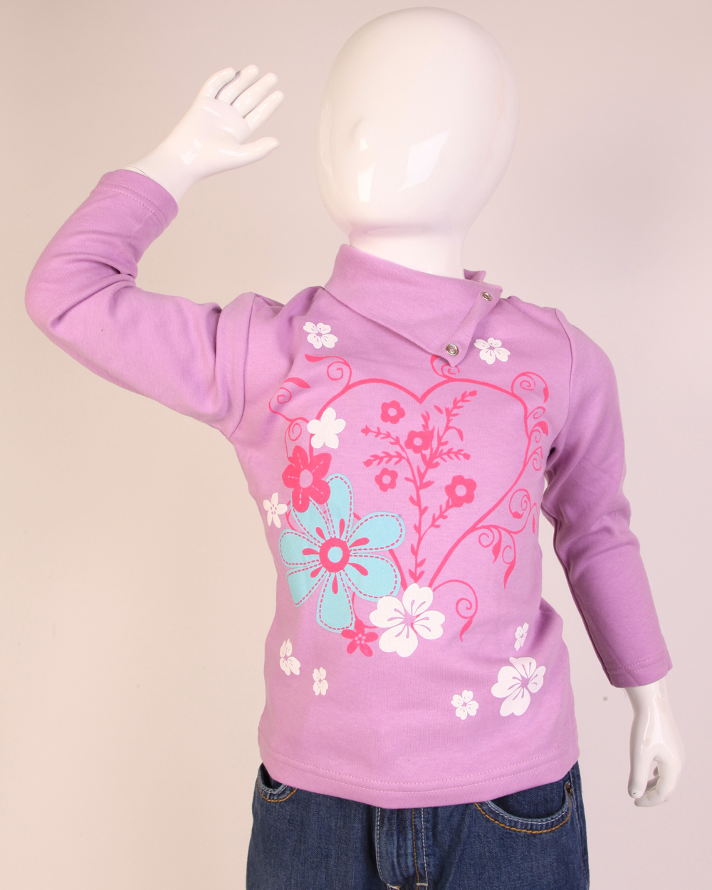 Очаровательный сиреневый джемпер для девочки с длинным рукавом и воротом, застегивающимся на кнопочки. Модель украшена цветочным принтом. Прекрасно подойдет для прогулки и встреч с друзьями.