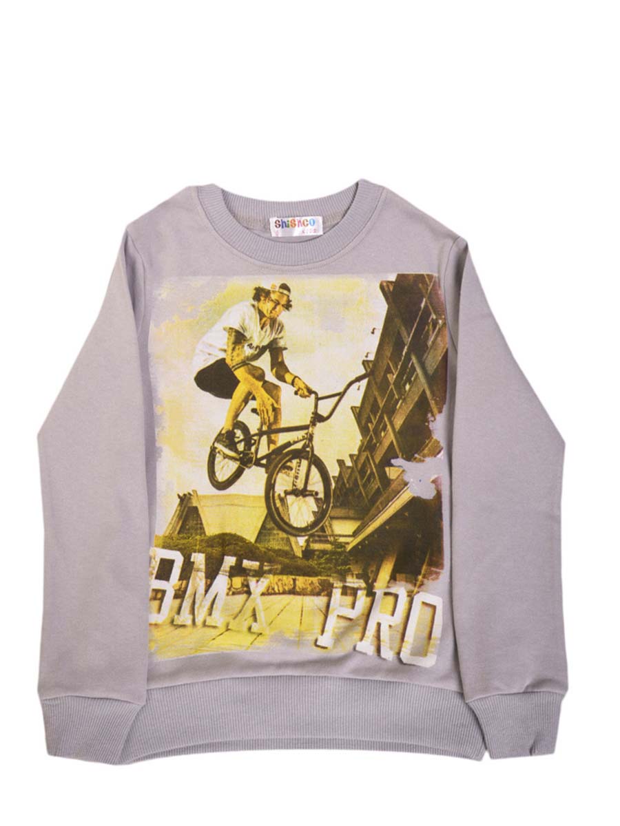 Детская толстовка-лонгслив модель серого цвета с принтом на передней части изделия.