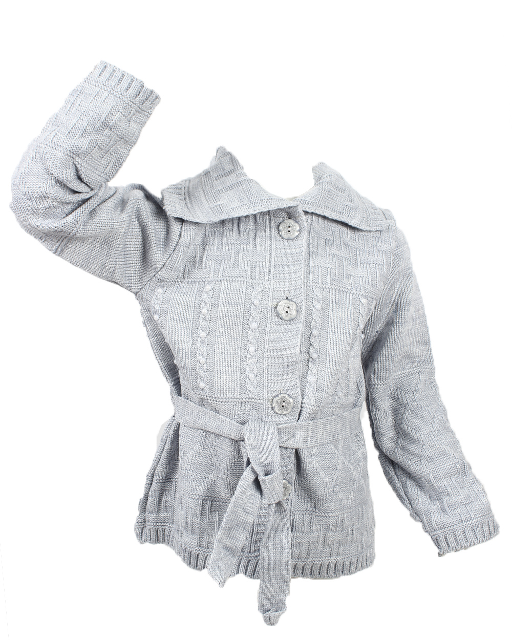 Симпатичный детский джемпер с поясом в комплекте. Модель застегивается на пуговицы. Отложной воротник.